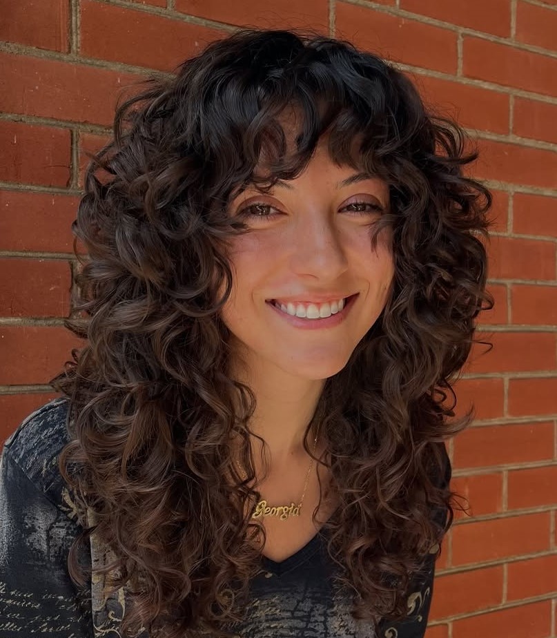 Curly-haired girls usually opt for mid-length cuts as they are easier to manage and style. But check out how stylish and luxurious this long curly shag looks! Pair these “seamless layers” with short, choppy bangs to add more life to your previously limp curls.