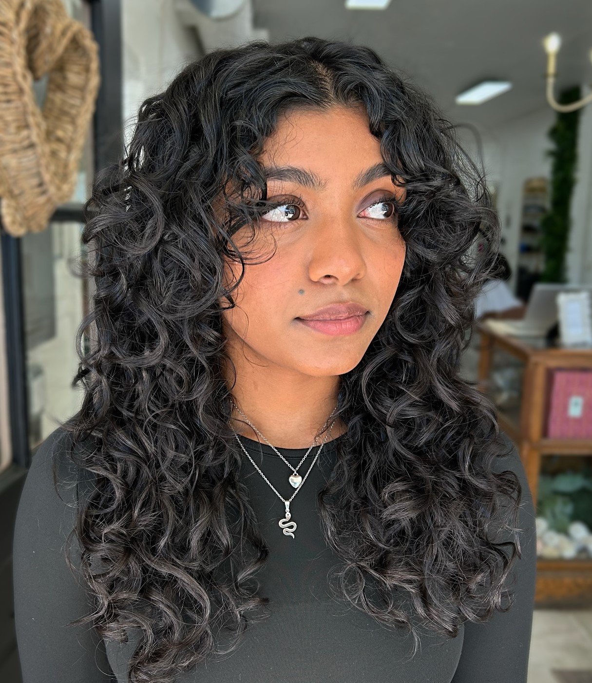 Curly-haired girls usually opt for mid-length cuts as they are easier to manage and style. But check out how stylish and luxurious this long curly shag looks! Pair these “seamless layers” with short, choppy bangs to add more life to your previously limp curls.