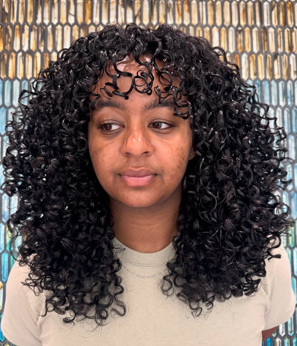 One of the easiest ways to make spirals seem modern is to wear them a little messy. The shaggy bangs in this look are sparse, allowing strands to separate and articulate, contrasting the overall density. After drying, slide fingers underneath your hair and massage the scalp to fluff.