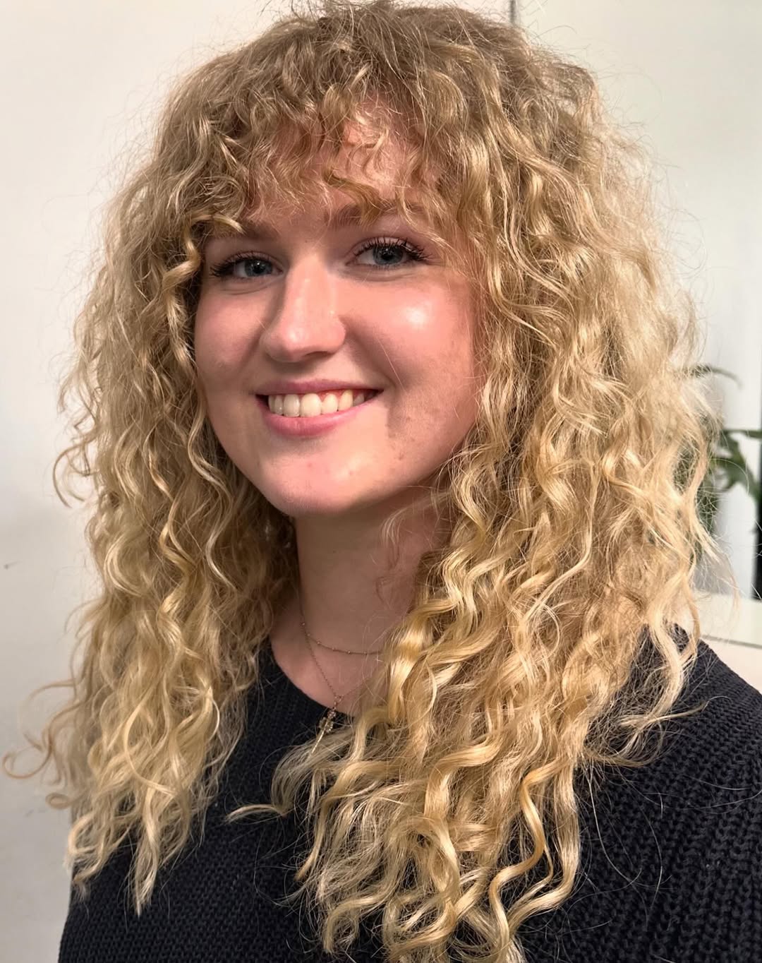 Curly bangs are often less of a commitment than we might think. You can take the time to style them forward to add interest and softness to your hair cut or leave them to part naturally and blend into layers, helping encourage volume and shape as they grow out.”