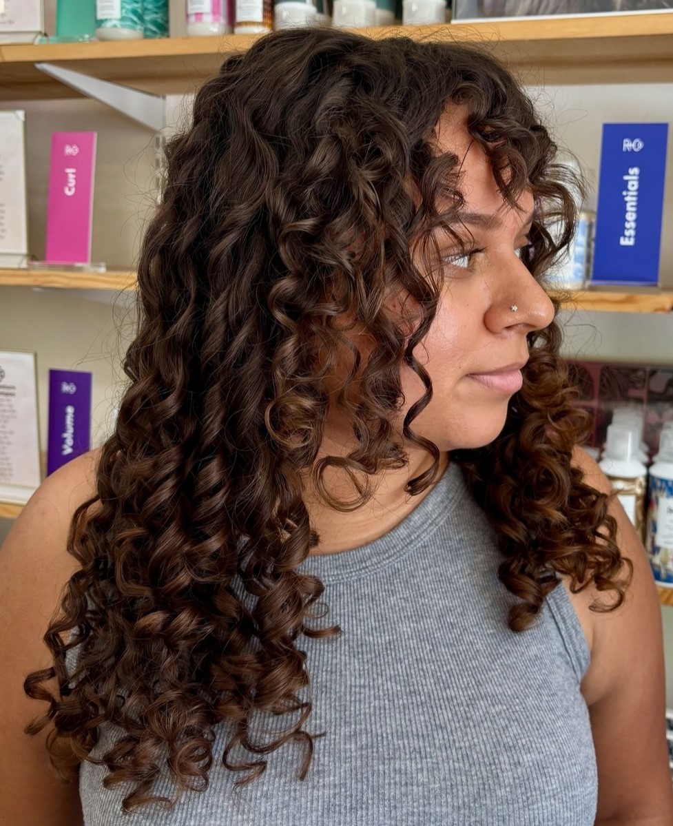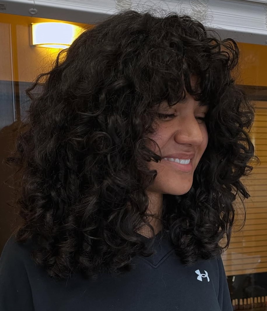 Curly-haired girls usually opt for mid-length cuts as they are easier to manage and style. But check out how stylish and luxurious this long curly shag looks! Pair these “seamless layers” with short, choppy bangs to add more life to your previously limp curls.