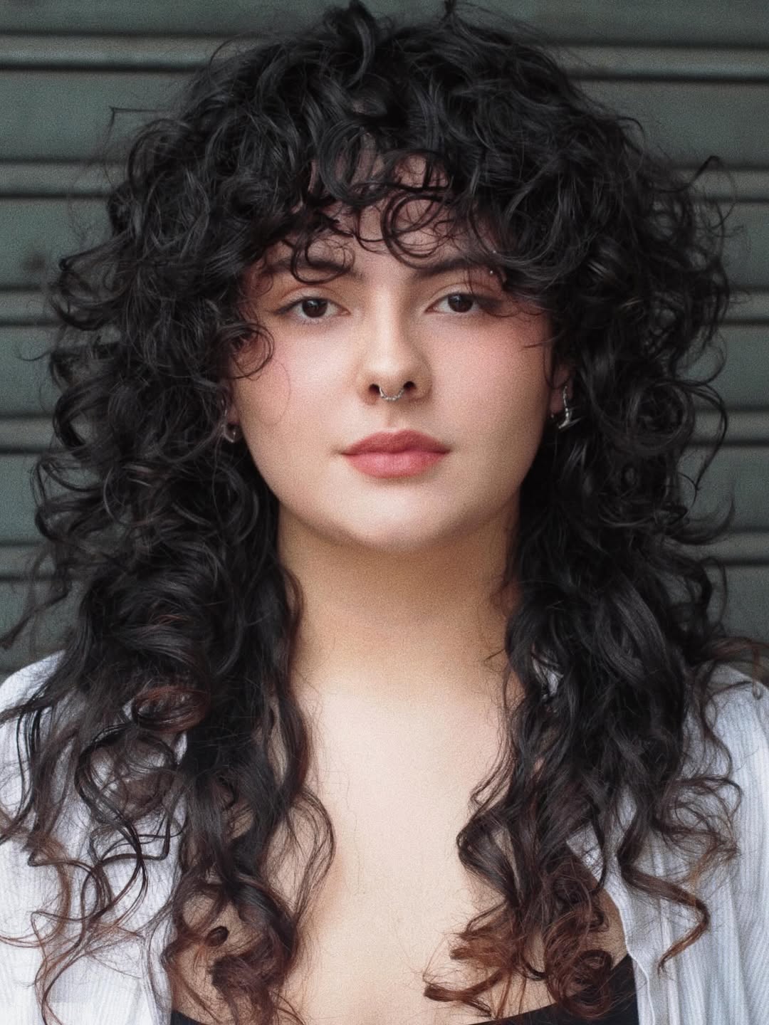 One of the easiest ways to make spirals seem modern is to wear them a little messy. The shaggy bangs in this look are sparse, allowing strands to separate and articulate, contrasting the overall density. After drying, slide fingers underneath your hair and massage the scalp to fluff.