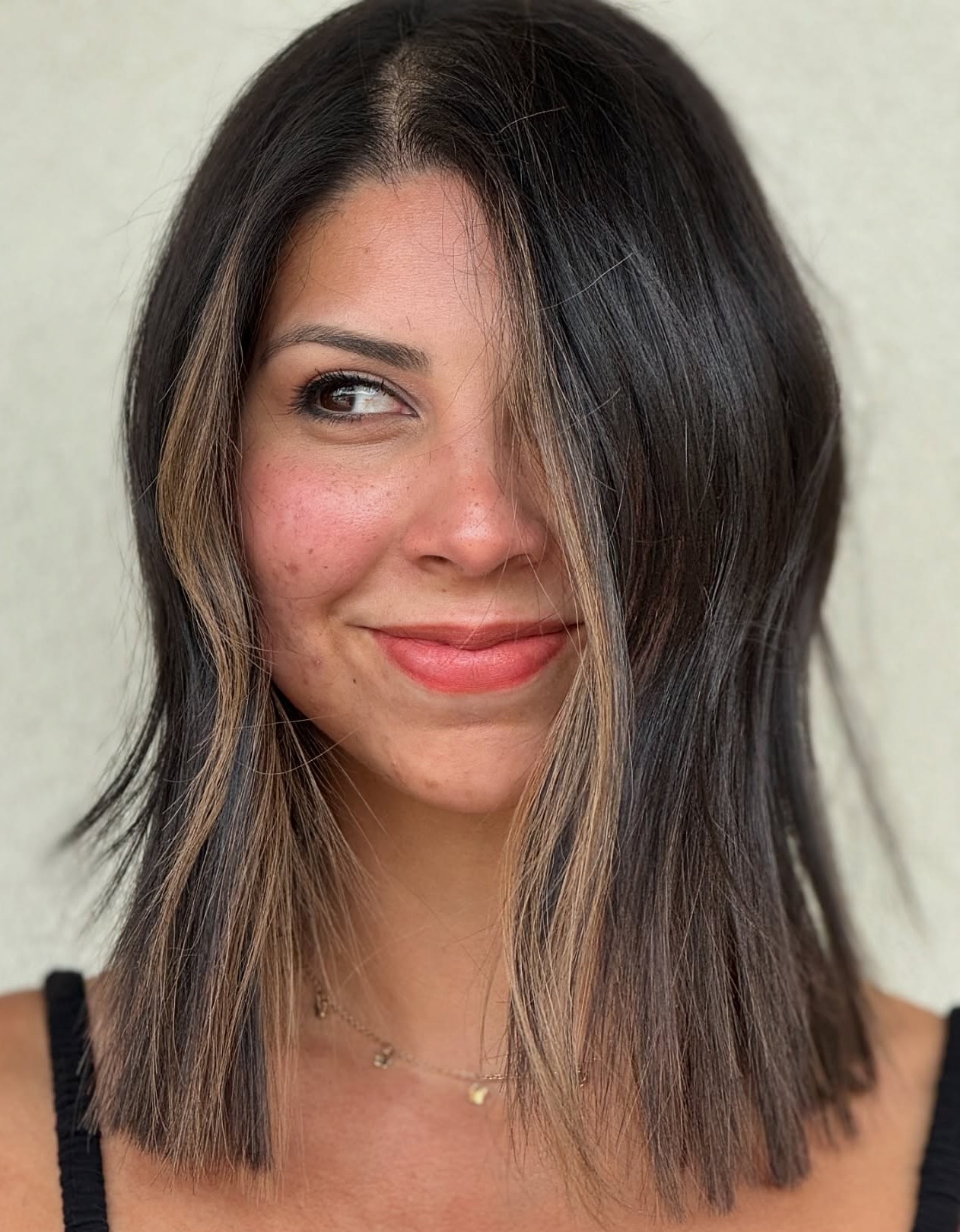 Thick and bouncy hair has a phenomenal way of being universally flattering. A shoulder-length lob that is slightly shorter in the back and graced with just a tinge of blonde highlights also enhances your stylish individuality.