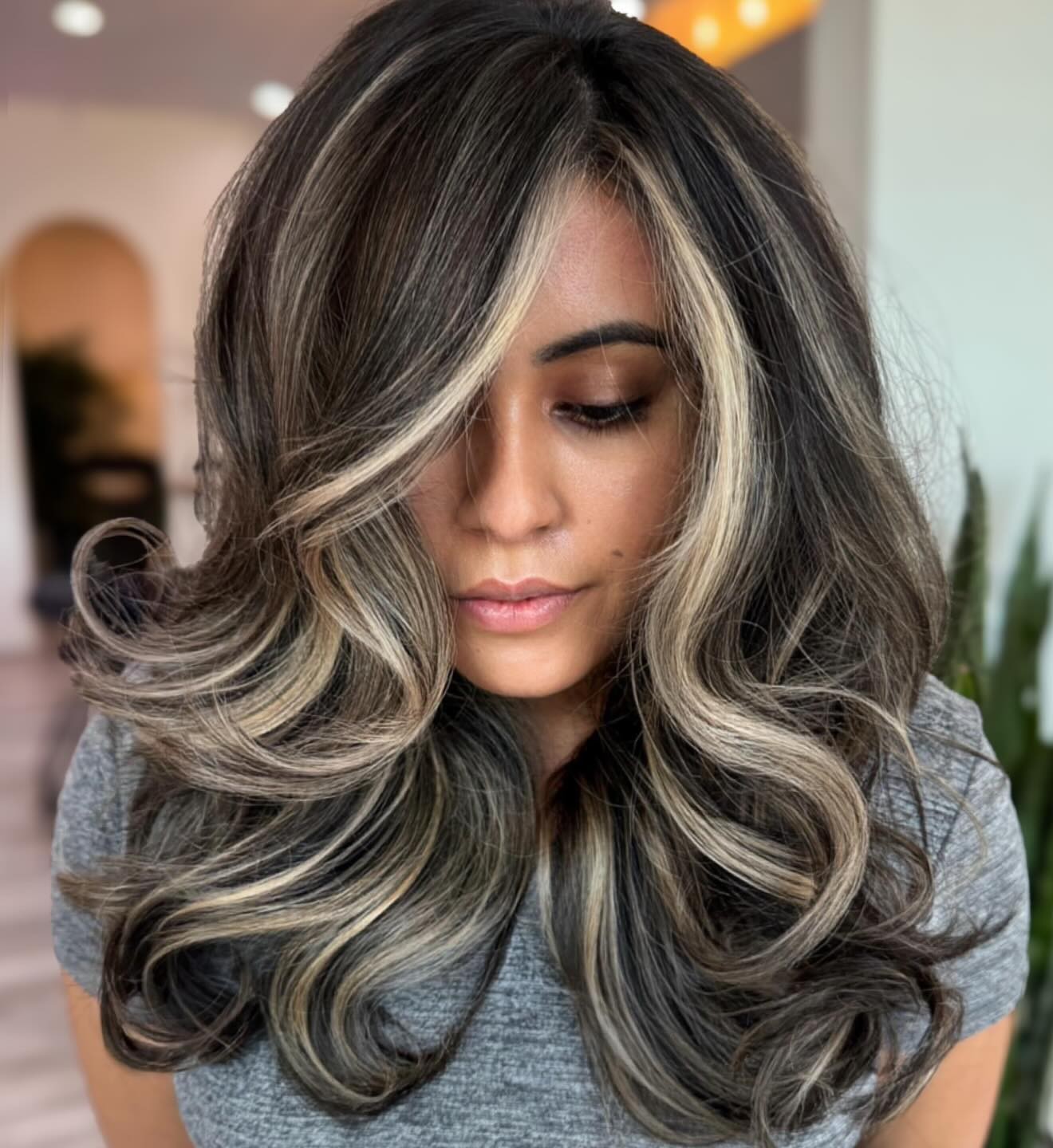 Lavender-tinted ash blonde framing highlights for dark brown hair are a modern way to make long hair look more grown up. The side part line and a long swoop of peek-a-boo bangs help to emphasize the lower part of the face, drawing attention to the cute chin and sexy lips.