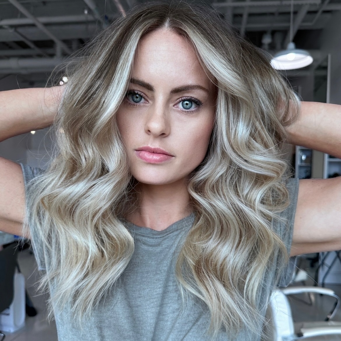The ash bronde tendrils, long choppy layers, and off-center parting help to frame and define your facial features. The sleek wave indents at the jawline, enhancing the outlines of the face.