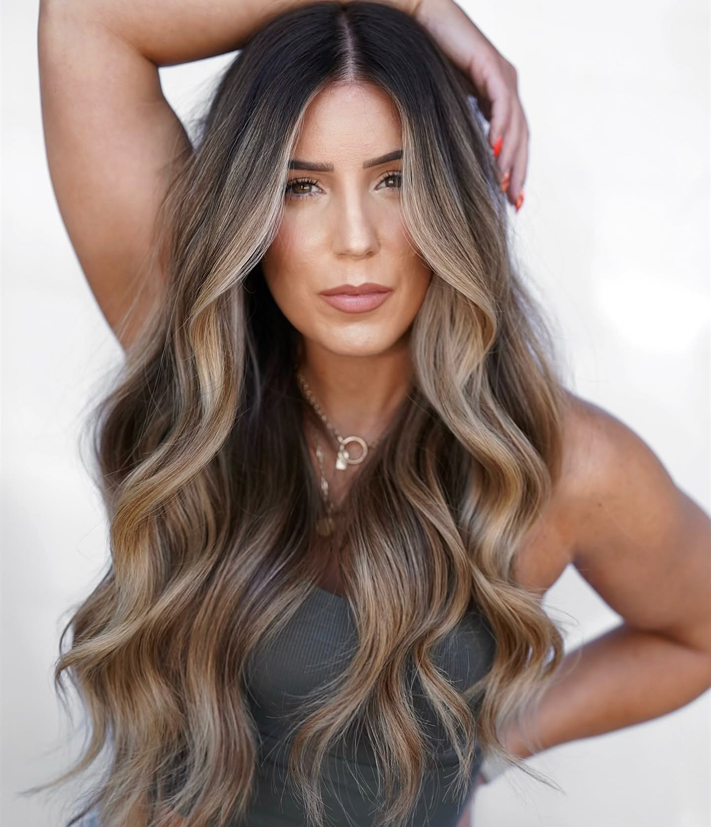 There’s no better way to liven up long and dull tresses that have lost their luster than adding some face-framing highlights on dark hair. Walnut brown tones run throughout the midsection all the way to the ends and outline your beautiful facial angles.