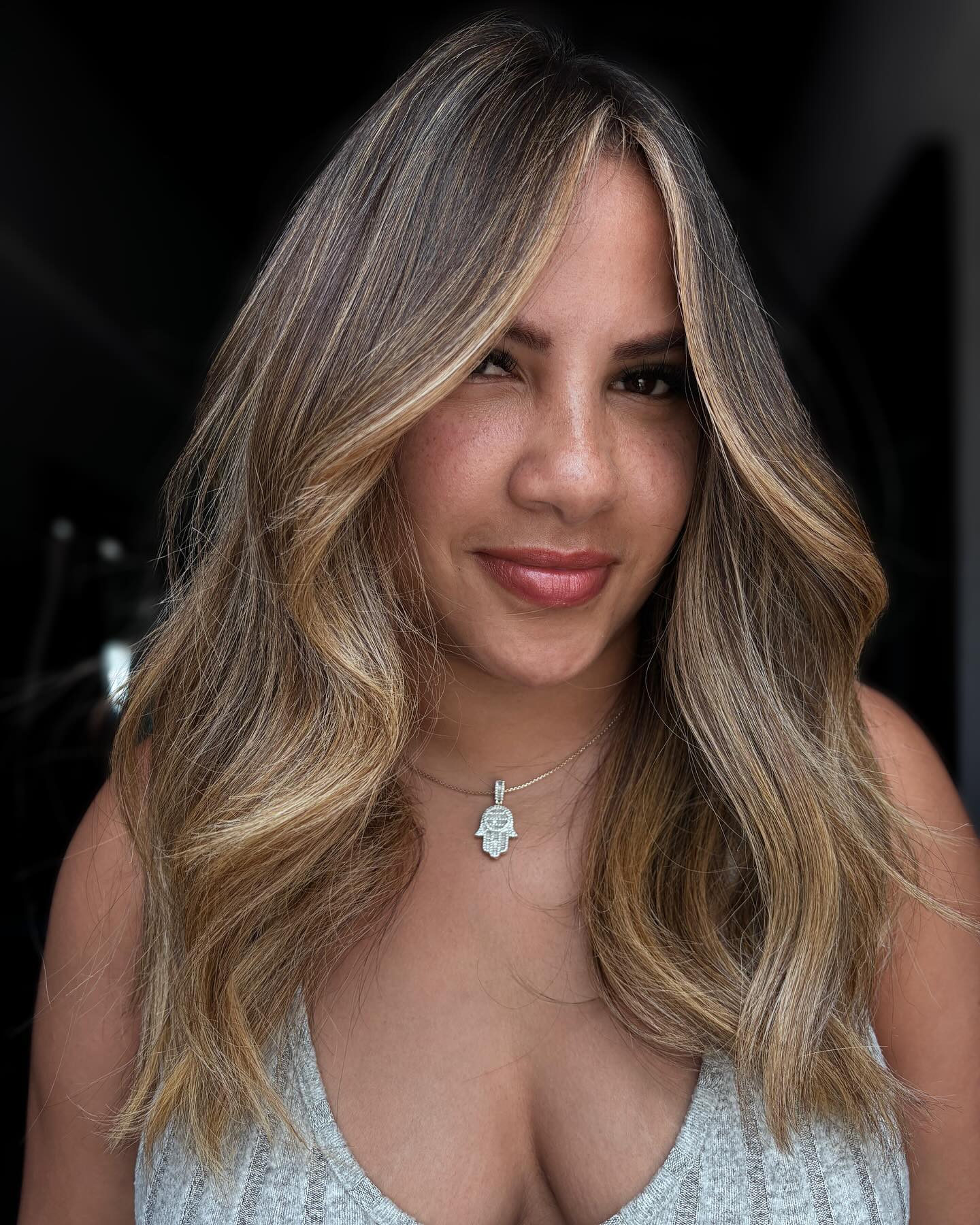 Sassy, sensual, and parted in the middle, the warm blonde tones of these striking highlights do a perfect job of accentuating the blue eyes and killer cheekbones. The sliced shoulder-length lob sets the stage for your dainty facial features.