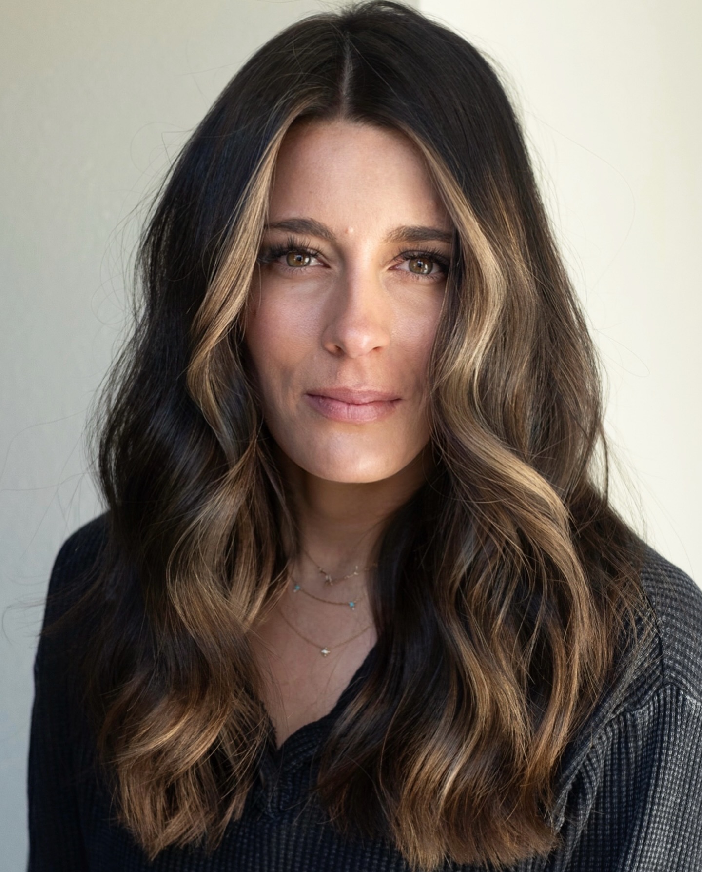 The walnut brown highlights on brunette hair frame the face in a rather symmetrical way. The waves tumble down the shoulders, brightening the complexion and bringing out the eyes. Choppy, textured ends help the hairstyle come off as casual and easygoing.