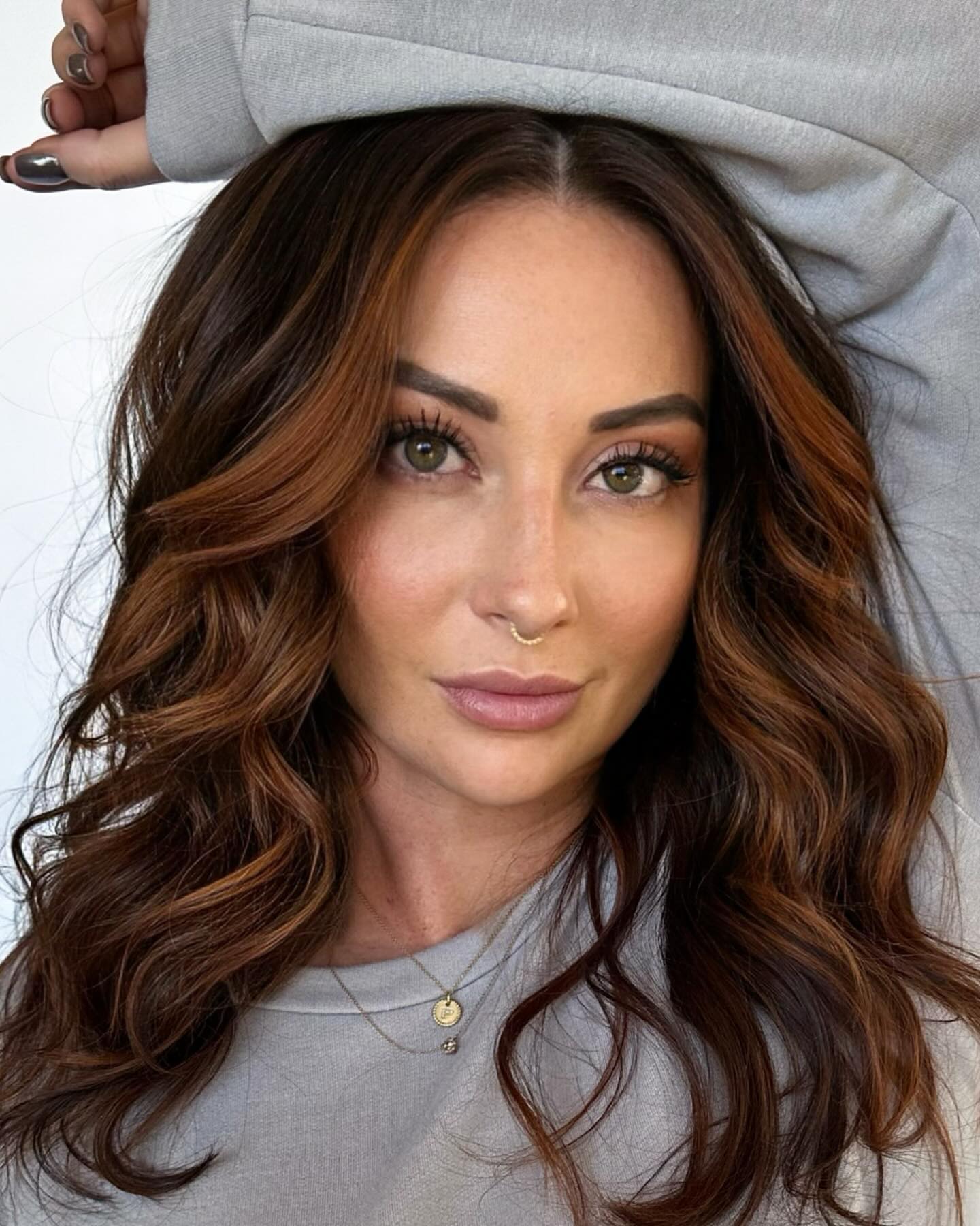 The walnut brown highlights on brunette hair frame the face in a rather symmetrical way. The waves tumble down the shoulders, brightening the complexion and bringing out the eyes. Choppy, textured ends help the hairstyle come off as casual and easygoing.