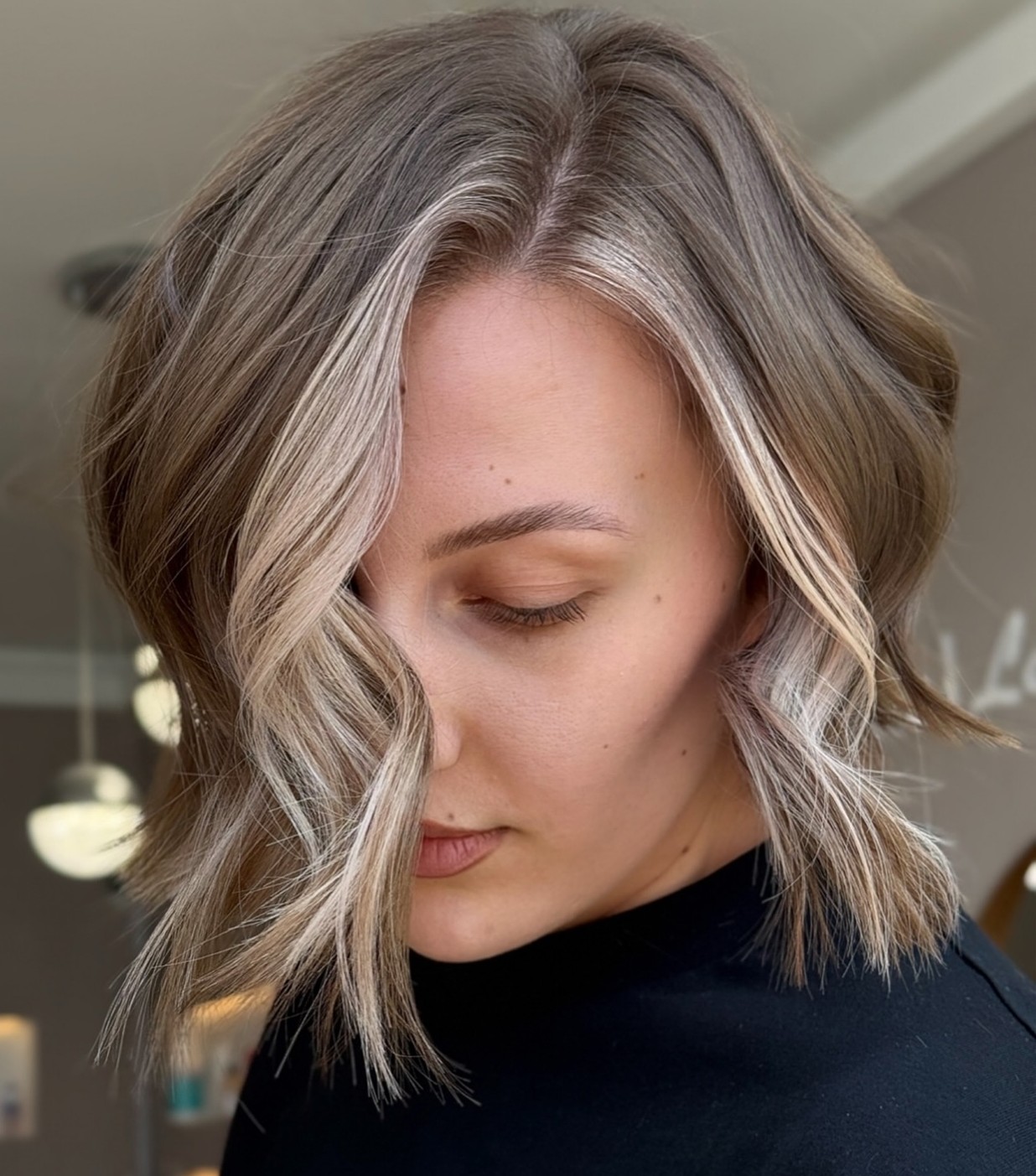 The ash bronde tendrils, long choppy layers, and off-center parting help to frame and define your facial features. The sleek wave indents at the jawline, enhancing the outlines of the face.