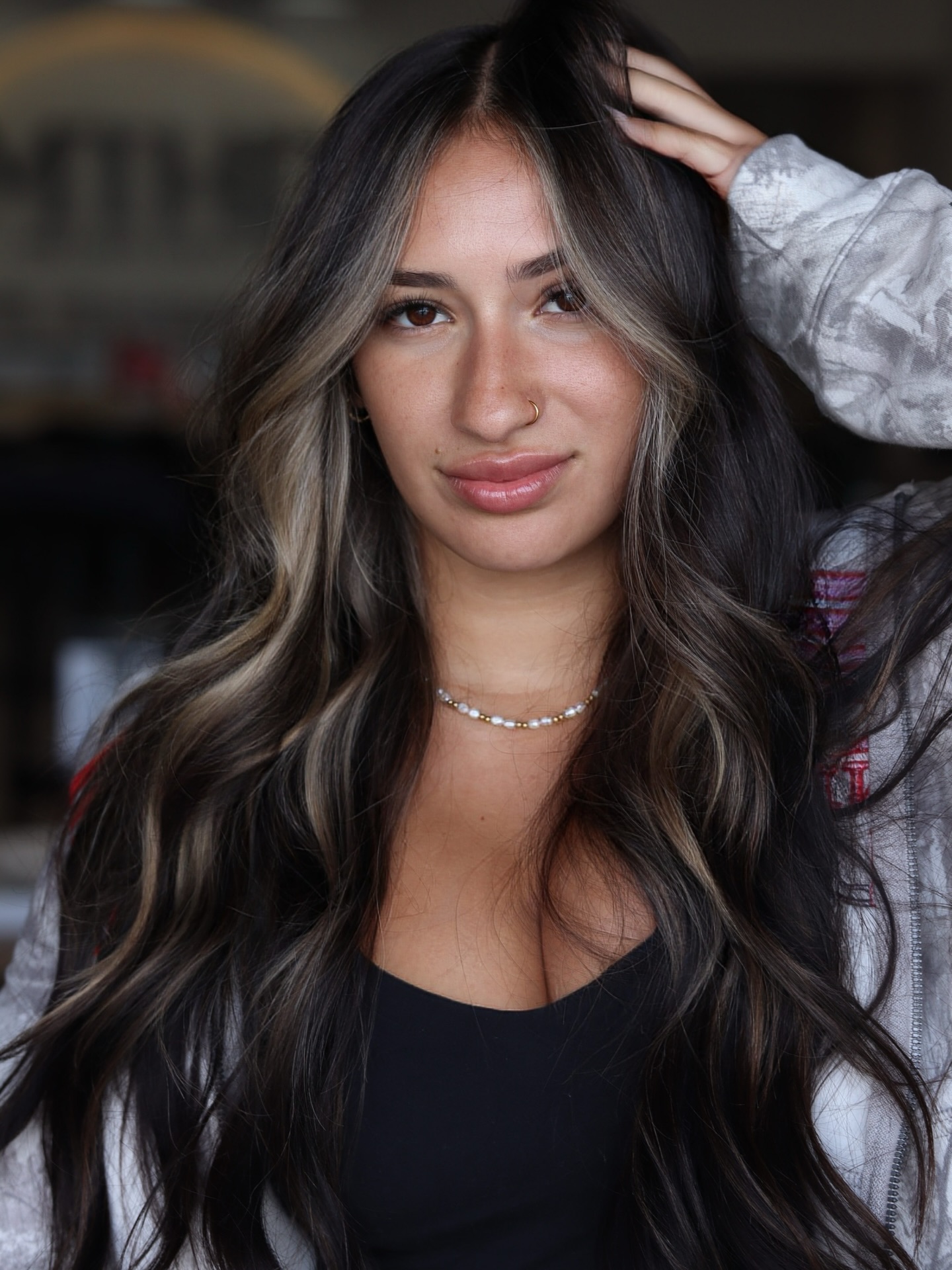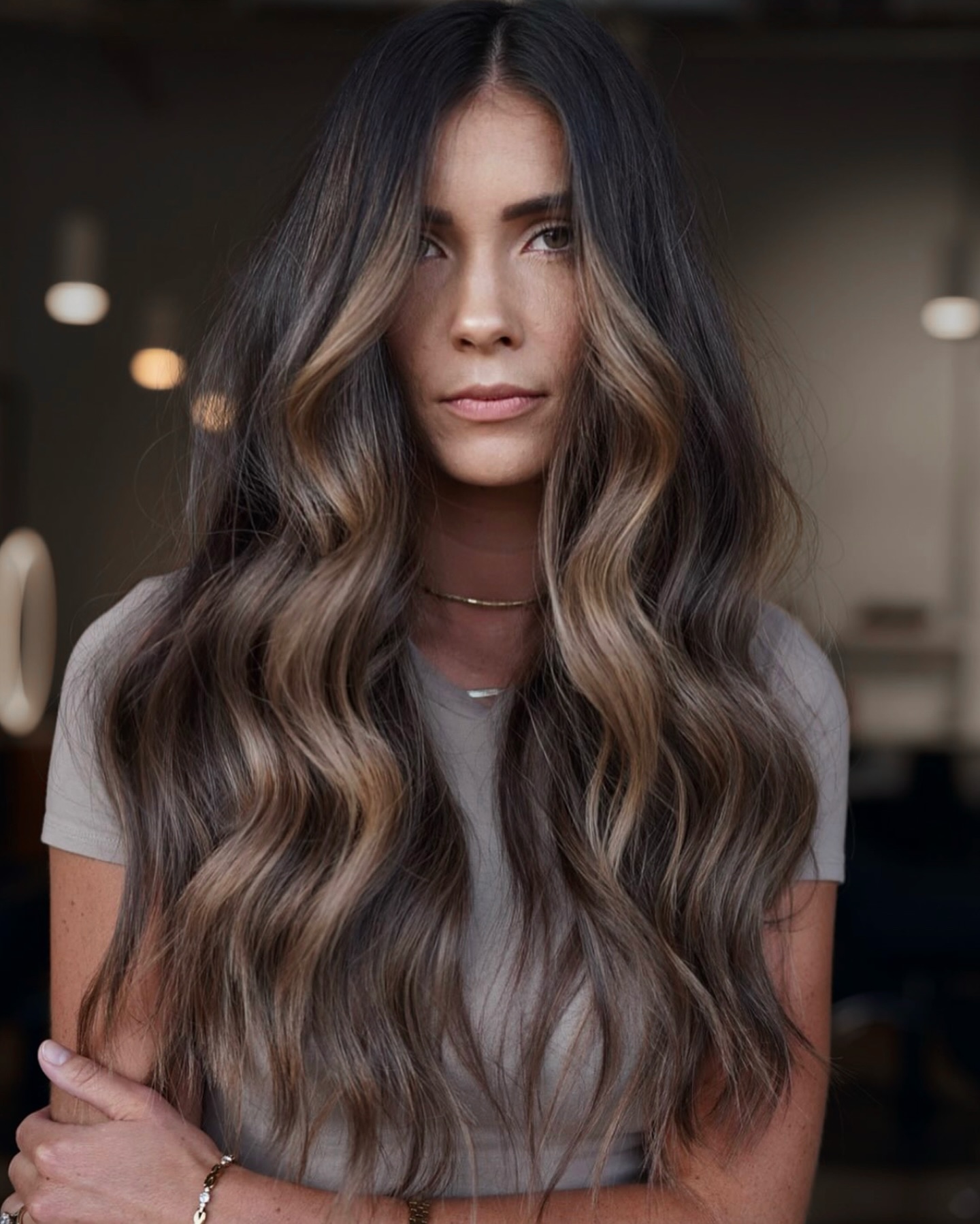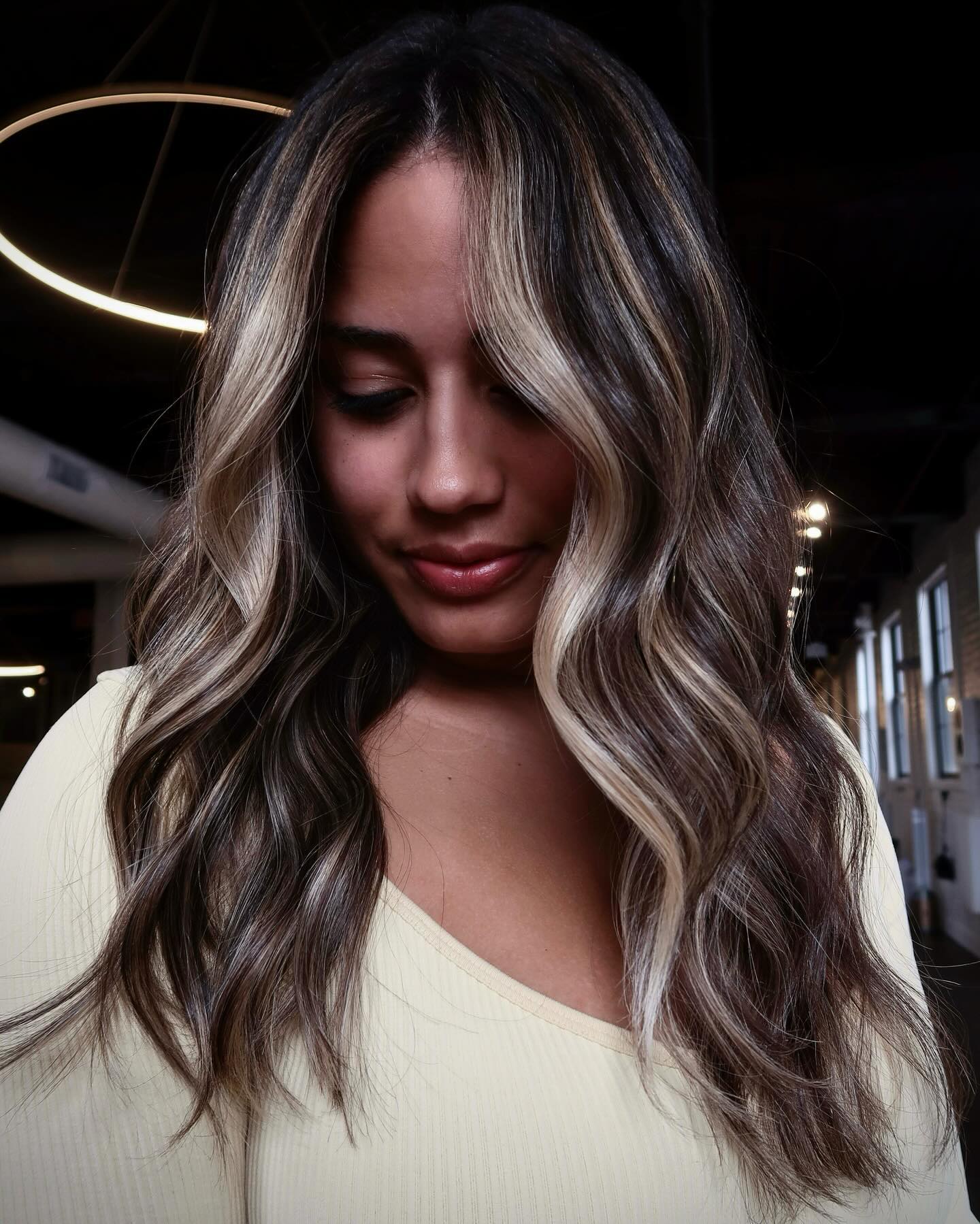 There’s no better way to liven up long and dull tresses that have lost their luster than adding some face-framing highlights on dark hair. Walnut brown tones run throughout the midsection all the way to the ends and outline your beautiful facial angles.