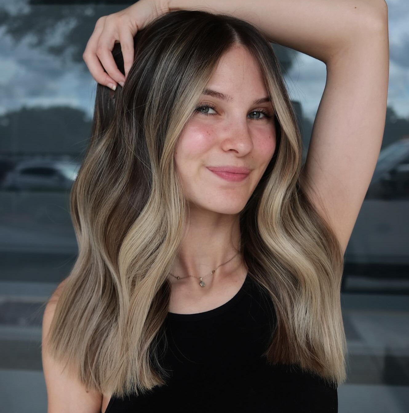 Sassy, sensual, and parted in the middle, the warm blonde tones of these striking highlights do a perfect job of accentuating the blue eyes and killer cheekbones. The sliced shoulder-length lob sets the stage for your dainty facial features.