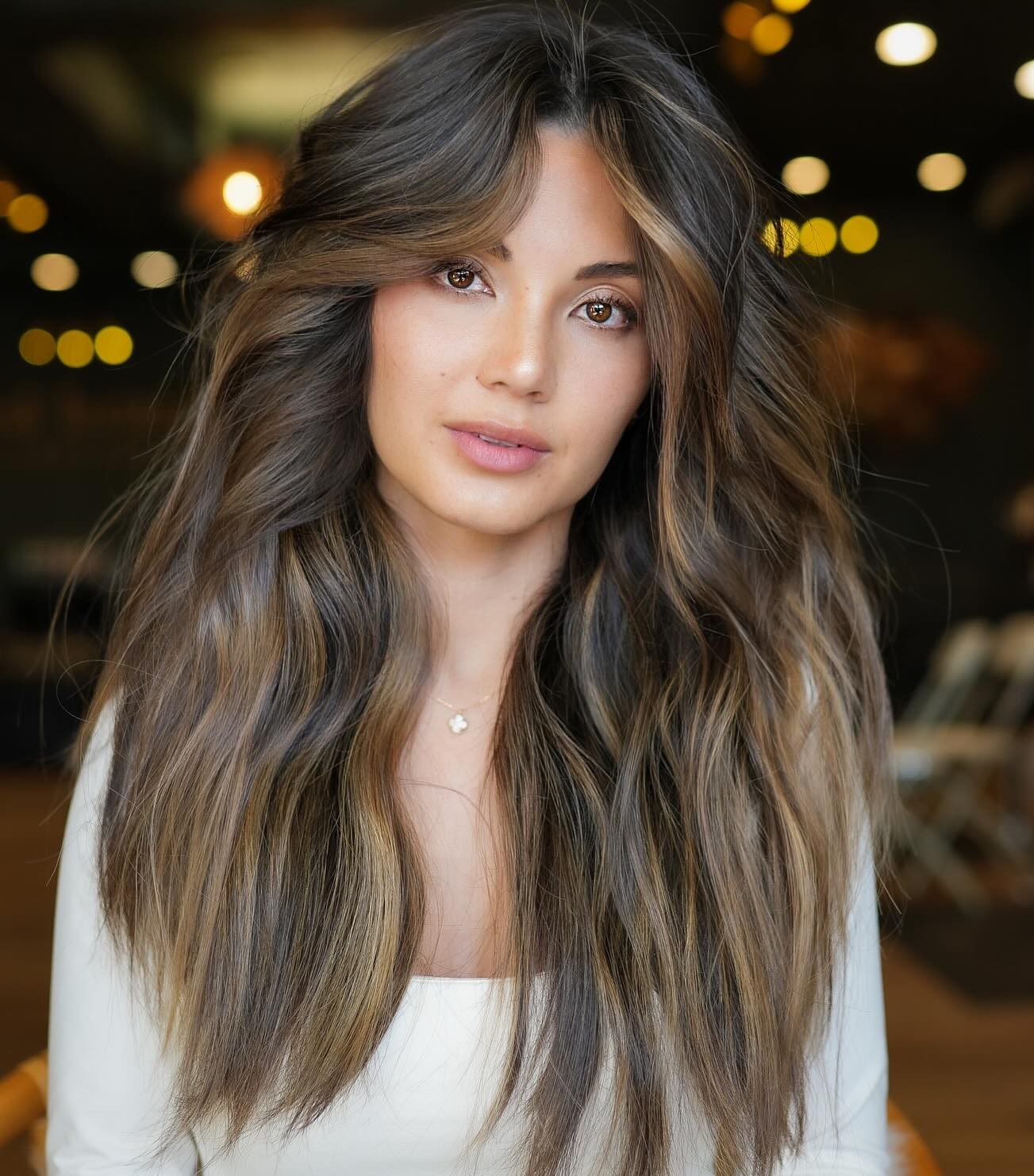 There’s no better way to liven up long and dull tresses that have lost their luster than adding some face-framing highlights on dark hair. Walnut brown tones run throughout the midsection all the way to the ends and outline your beautiful facial angles.