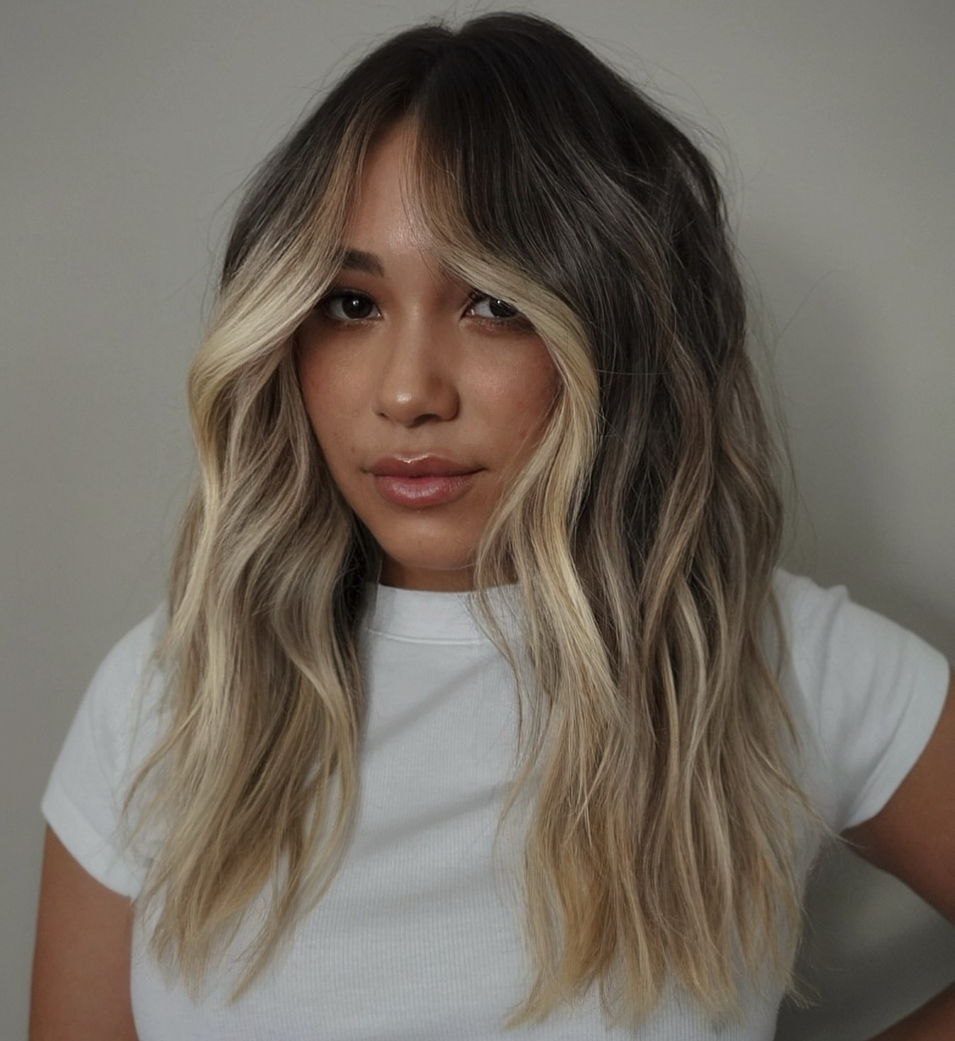 The ash bronde tendrils, long choppy layers, and off-center parting help to frame and define your facial features. The sleek wave indents at the jawline, enhancing the outlines of the face.