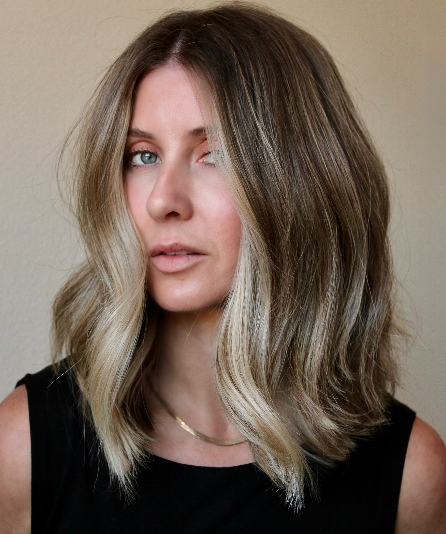 Sassy, sensual, and parted in the middle, the warm blonde tones of these striking highlights do a perfect job of accentuating the blue eyes and killer cheekbones. The sliced shoulder-length lob sets the stage for your dainty facial features.