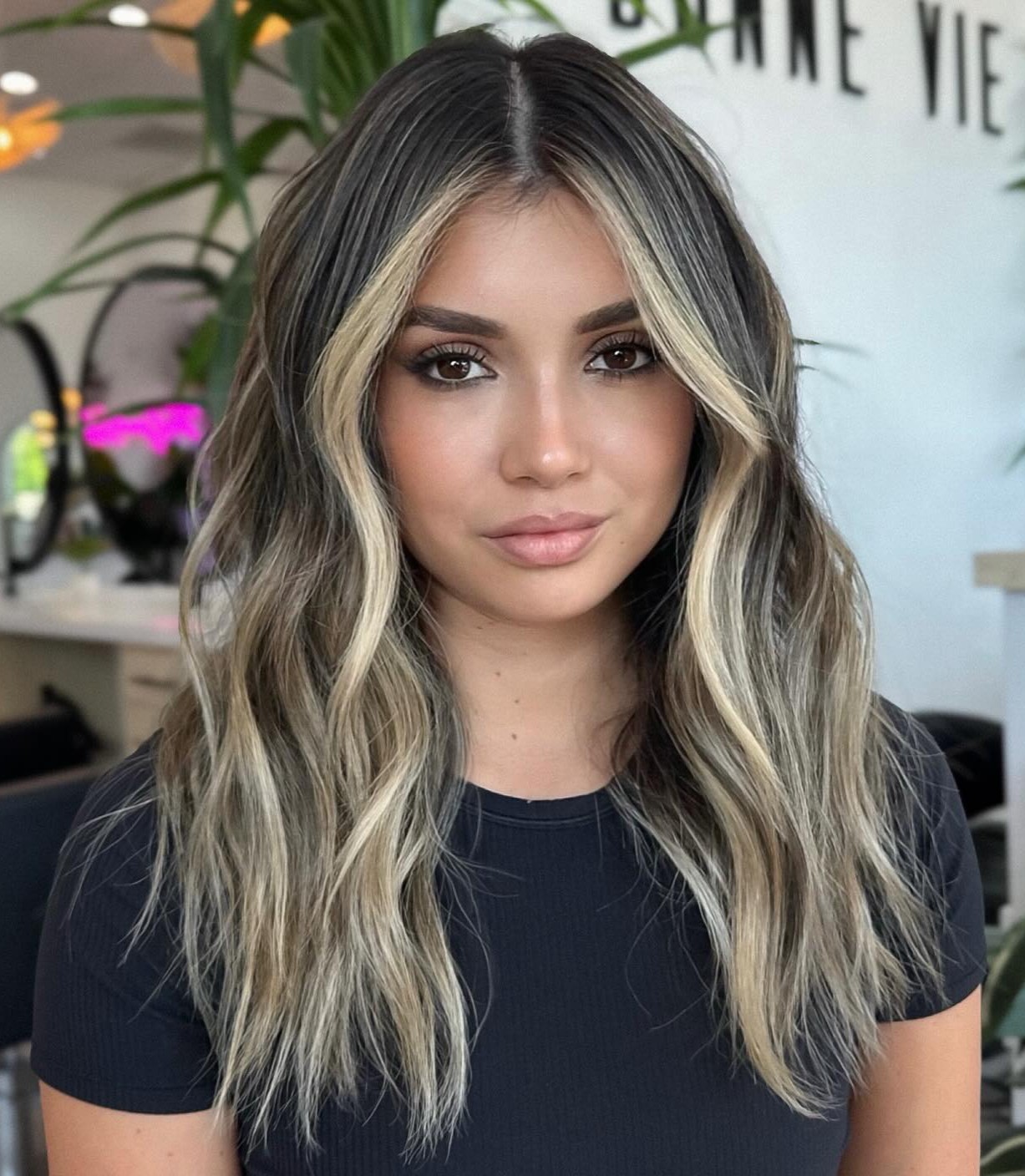 There’s no better way to liven up long and dull tresses that have lost their luster than adding some face-framing highlights on dark hair. Walnut brown tones run throughout the midsection all the way to the ends and outline your beautiful facial angles.