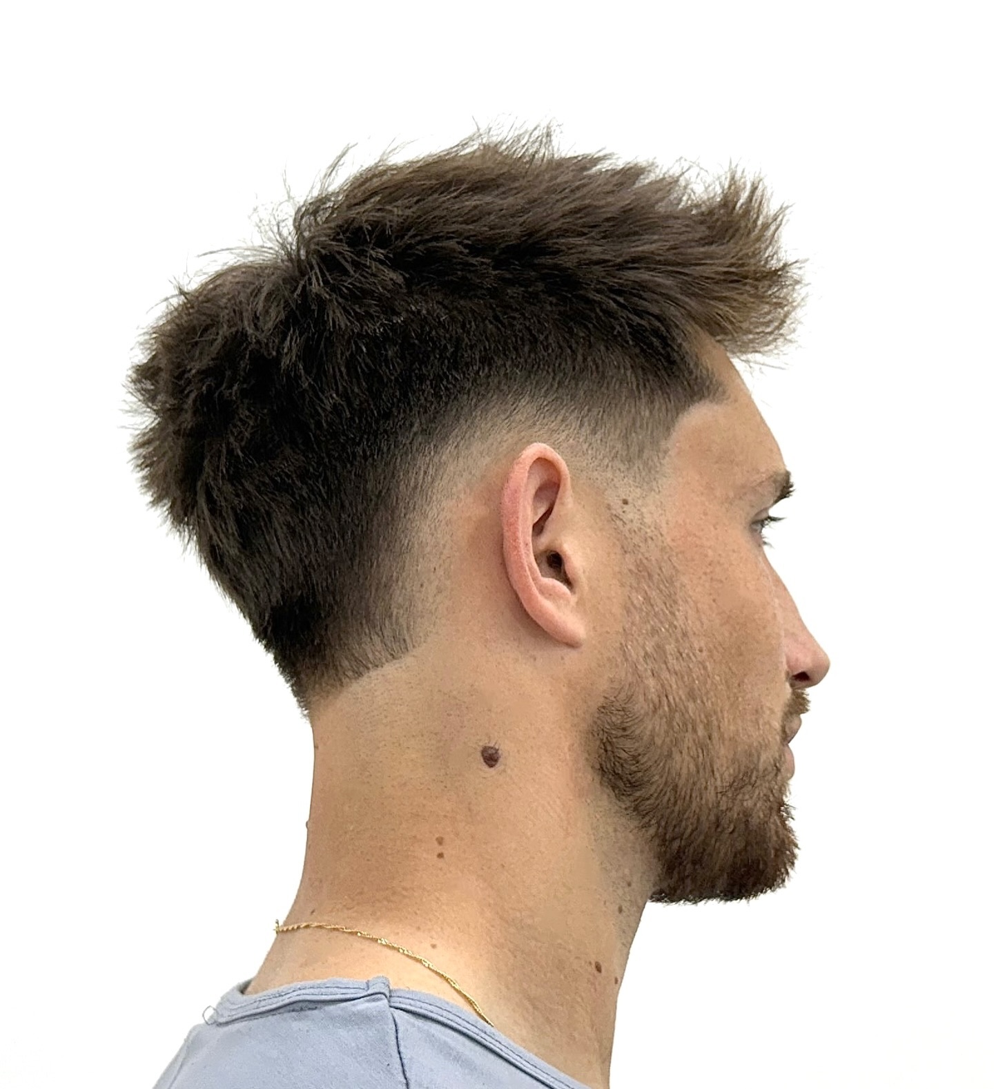 The way your haircut is parted makes all the difference in how it looks. This style is parted deeply on each side and then faded, while the top is more understated and simply spiked up.
