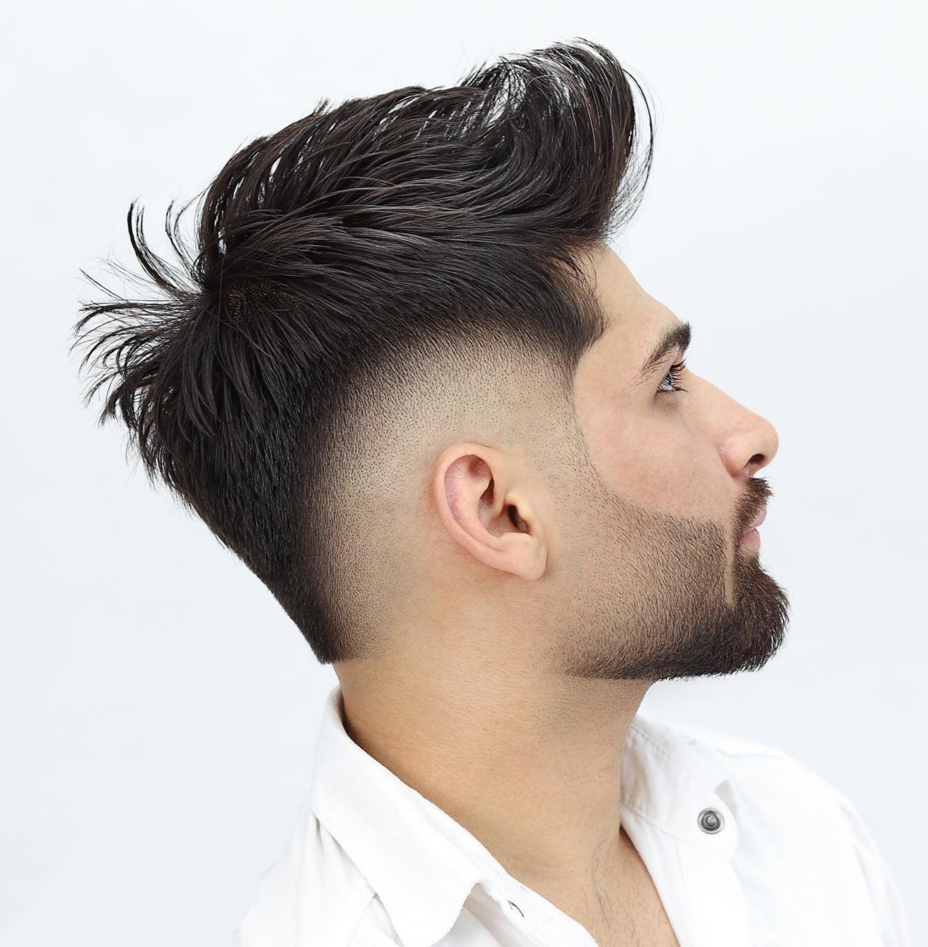 To show the contrast between long and short hair strands even more, ask your barber to make a bald fade. While temples and nape are super-short, the long top can be styled like a fake hawk or a modern pompadour.