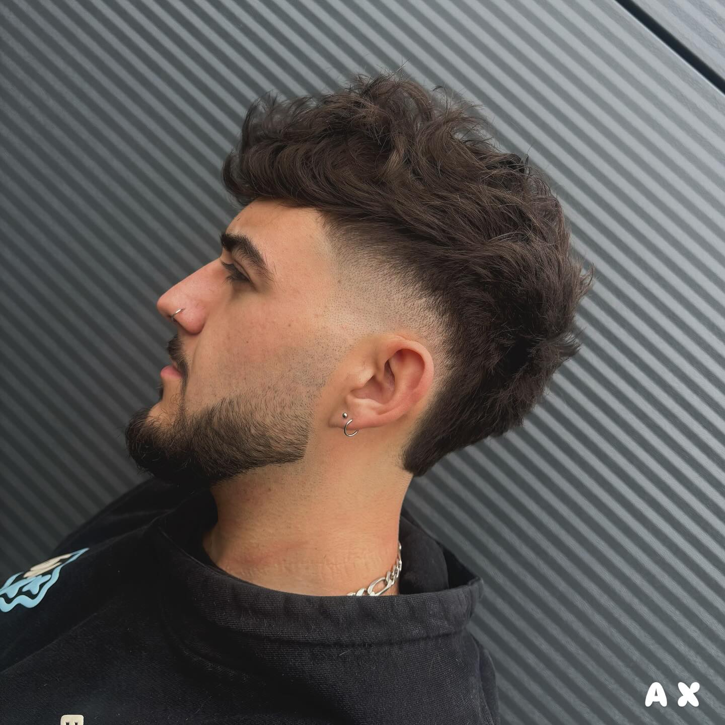 The cut works well with a variety of hair textures. This one is done on naturally curly hair, the sides are low and faded.