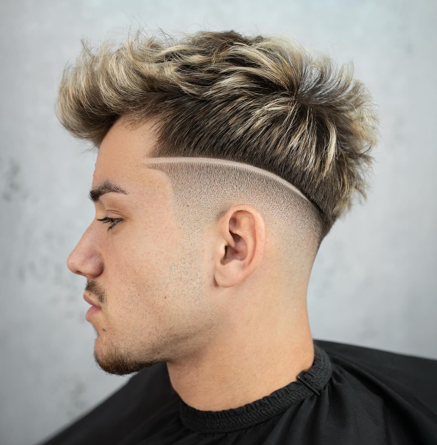 This faux hawk haircut for men features a cute fade on the sides, but it’s the funky texture at the top that gives it the edge. The front of the cut is twisted for texture enhancement and highlighted with the shaved line.