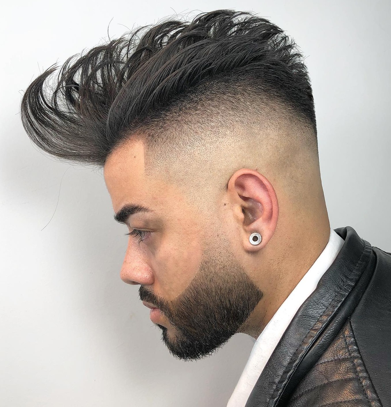 To show the contrast between long and short hair strands even more, ask your barber to make a bald fade. While temples and nape are super-short, the long top can be styled like a fake hawk or a modern pompadour.