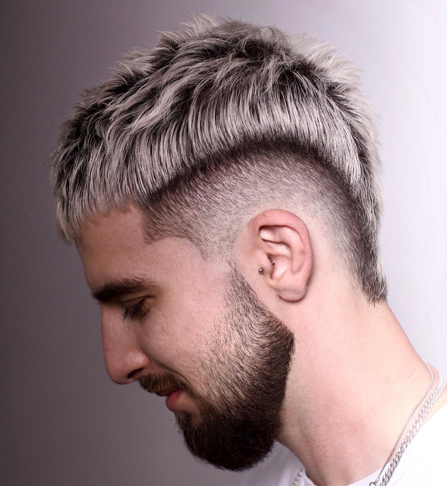 When you think of a Mohawk, chances are high a rockstar look like in the photo comes to your mind. The front is perfectly spiked, while the sides and the back are faded smoothly.
