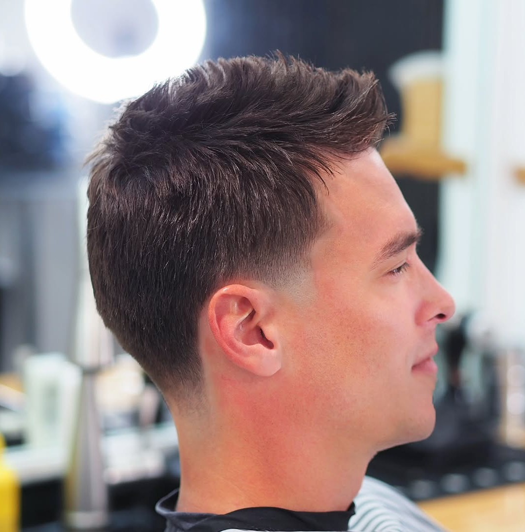 This faux hawk haircut for men features a cute fade on the sides, but it’s the funky texture at the top that gives it the edge. The front of the cut is twisted for texture enhancement and highlighted with the shaved line.