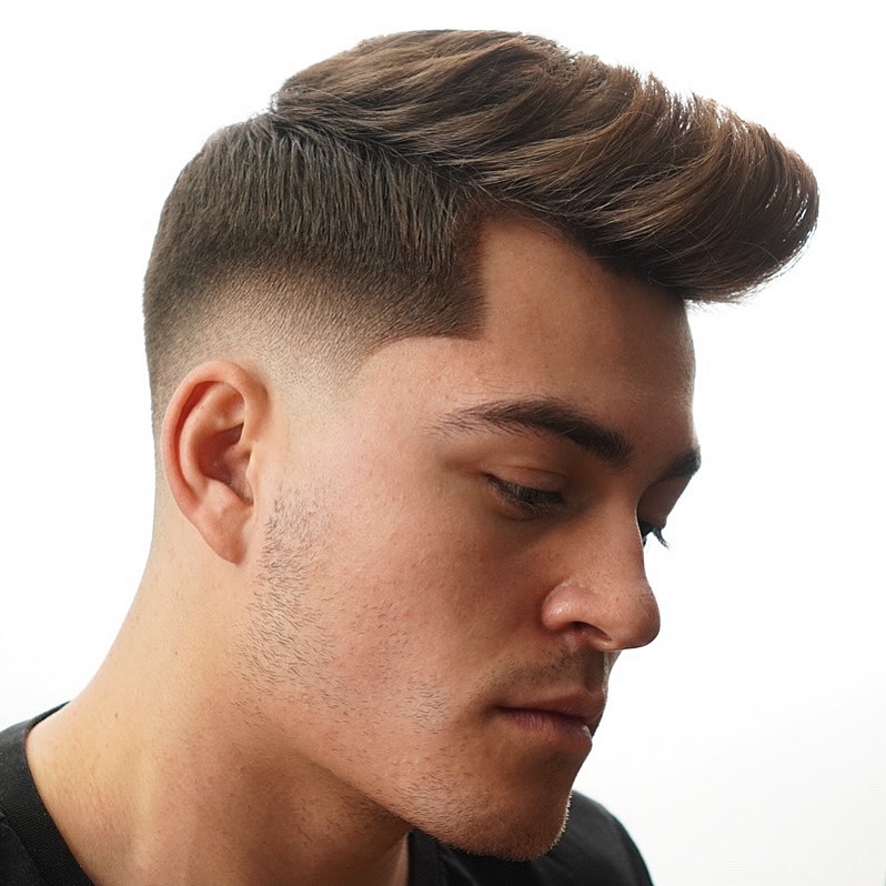 The majority of faux hawk haircuts for men are punctuated by their spiky top that channels rockstar chic. However, it’s also possible to keep your hair relatively smooth. The hair in the top, back and sides is neatly brushed and smoothed with a slight spike. We love the taper fade harmoniously blended into the style.