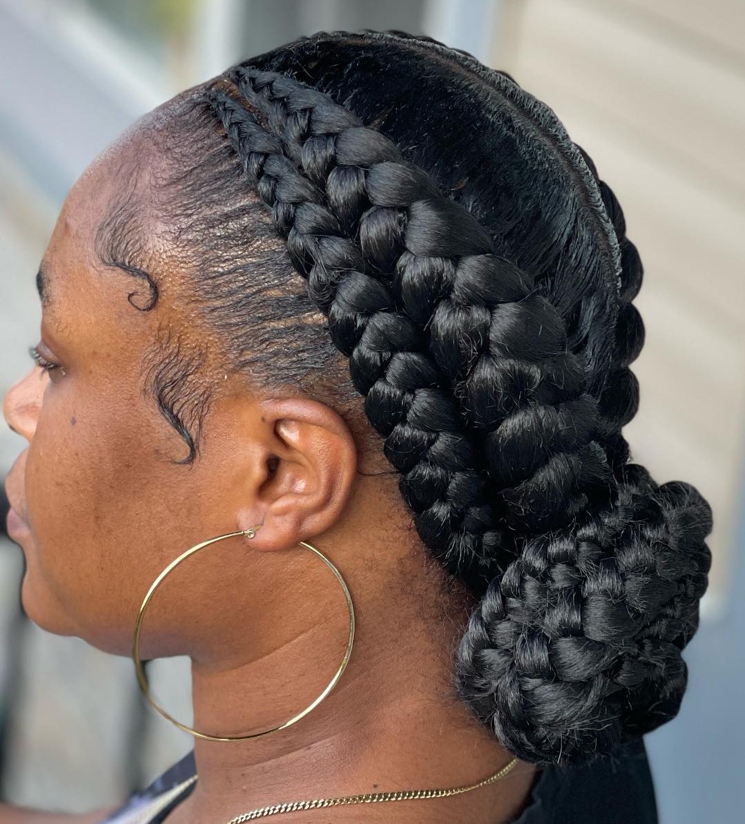 2 goddess braids are better than 1, and 4 or 5 braids are the ideal number if you want to pull your hair up into a bulky braided bun. You can use some shine enhancer or similar product to keep things slicked down and perfectly in place.