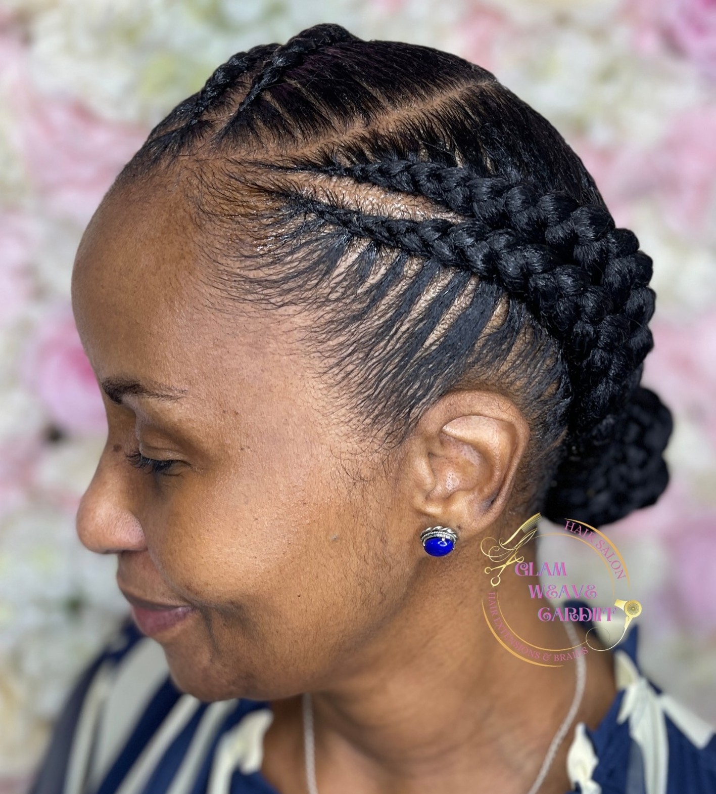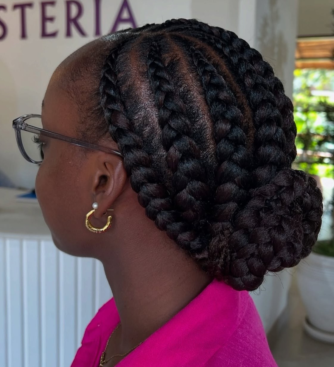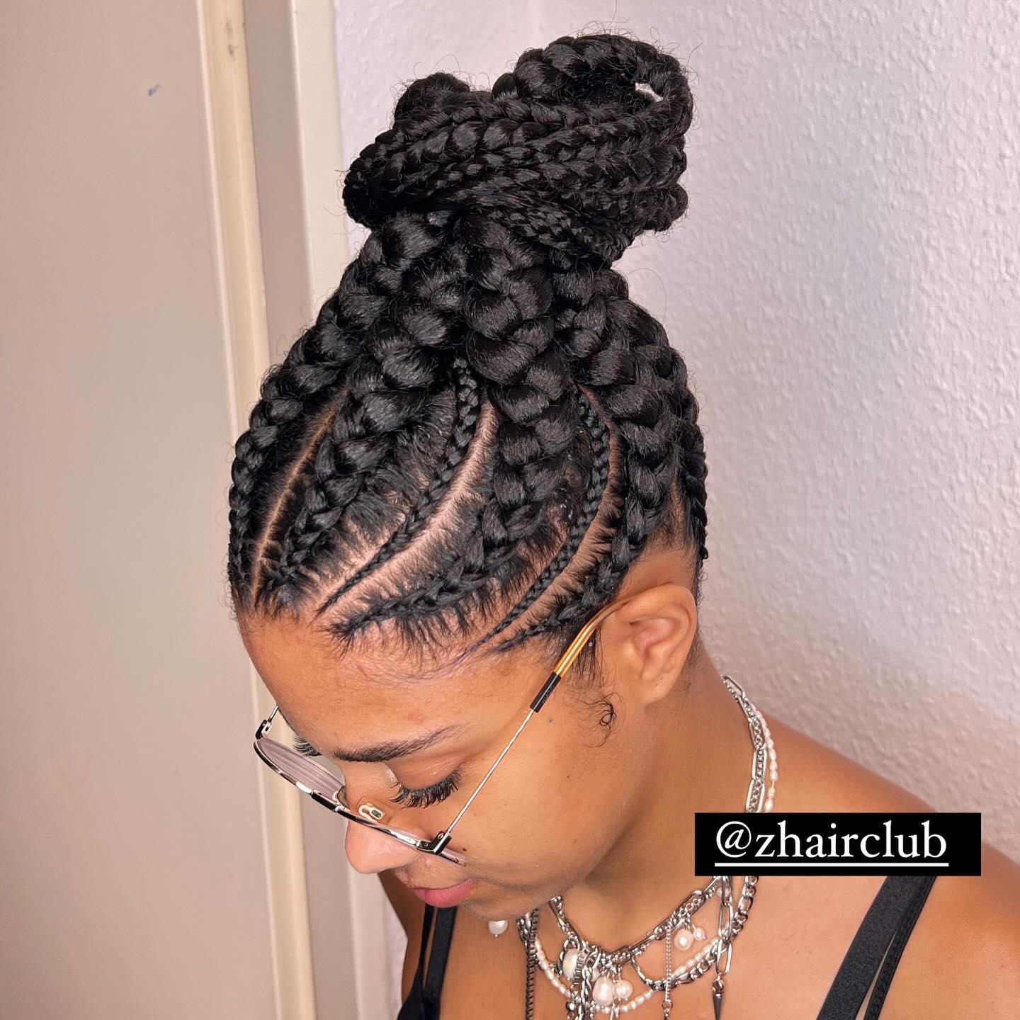 The regal and stately goddess updo with a high braided bun is a look that never goes out of style. Thicker cornrows and interspersed mini parting braids go straight up from the hairline to meet on the crown and be crowned with a tall classy bun.
