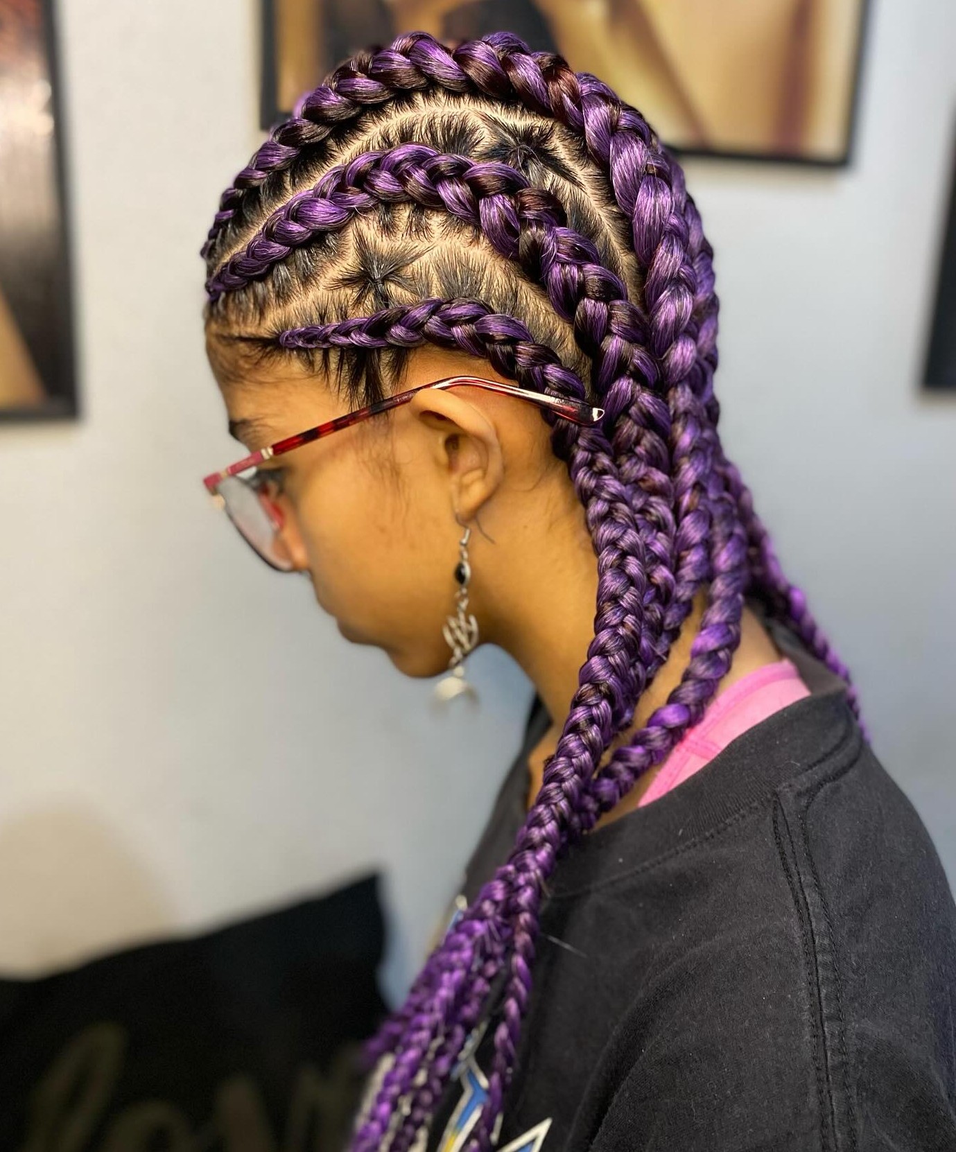 Whoever invented Goddess braids hairstyles could have never imagined such a creative variation. Laid edges set off the winding iridescent braids that offer a look of a regal Goddess crown. The circular pattern curves around the scalp, ending full force in shiny, deep-purple braids that are long enough to throw over your shoulder like a scarf!