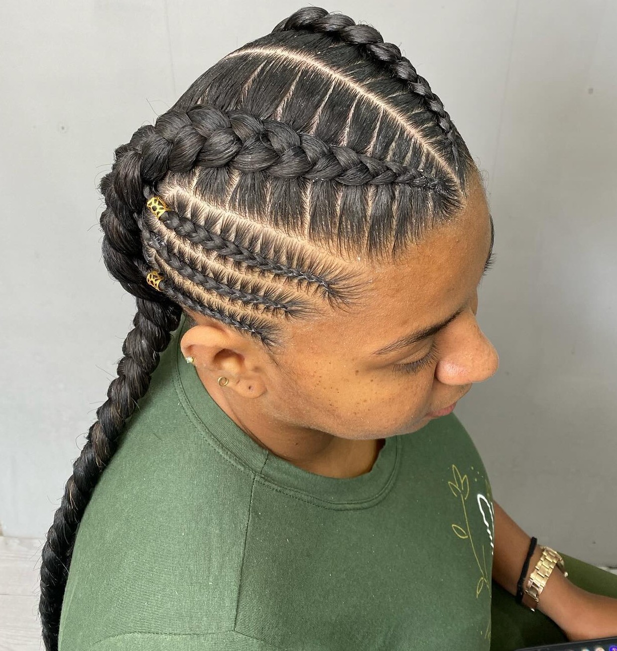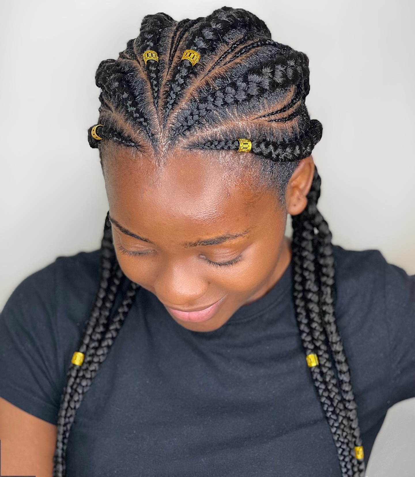 The truth of the matter is that pretty much anyone out there can rock intricate designs with their hair. Using small goddess braids along with some chunkier plaits means that you choose an urban style fit for a queen. Look at these flared rows, they are just stunning.
