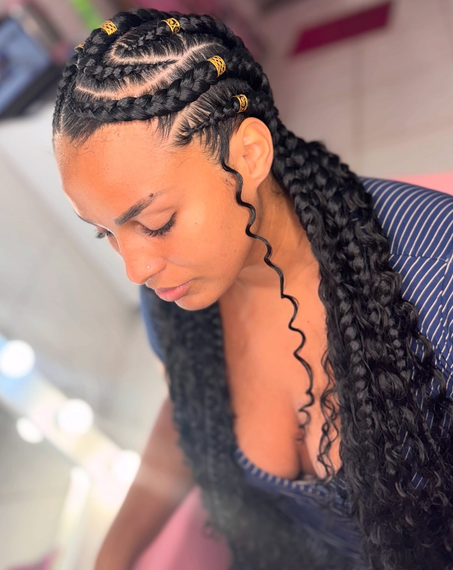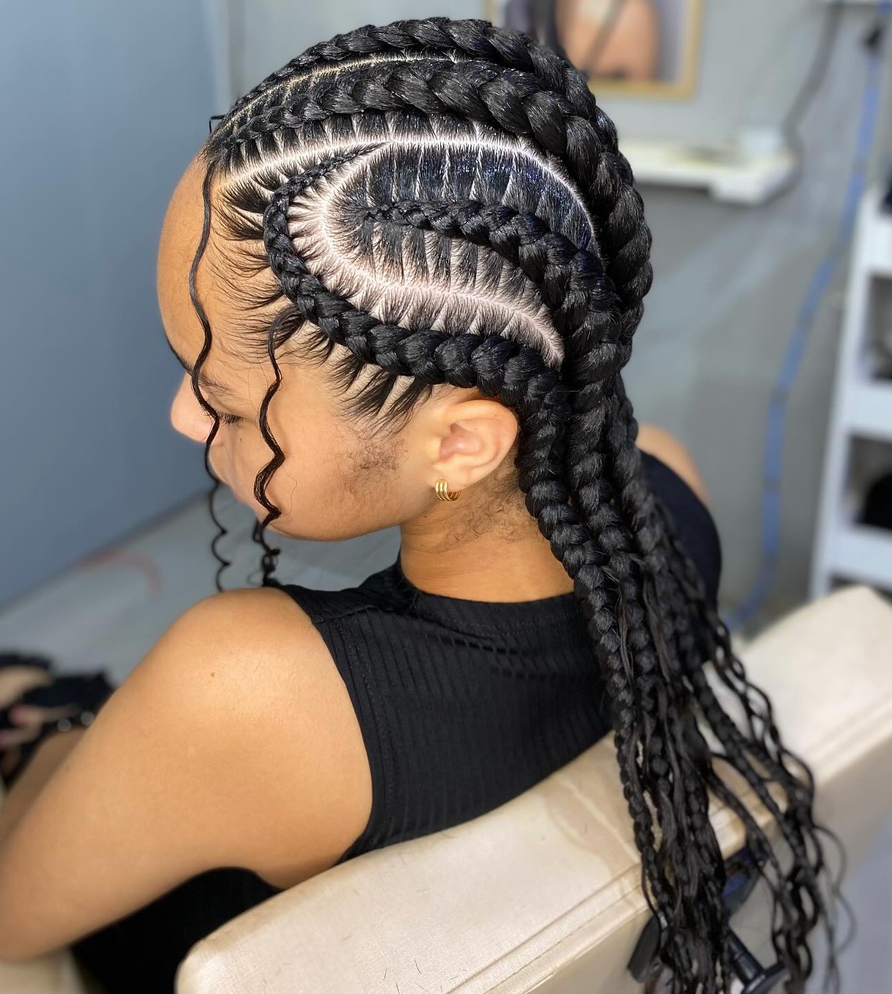 The truth of the matter is that pretty much anyone out there can rock intricate designs with their hair. Using small goddess braids along with some chunkier plaits means that you choose an urban style fit for a queen. Look at these flared rows, they are just stunning.