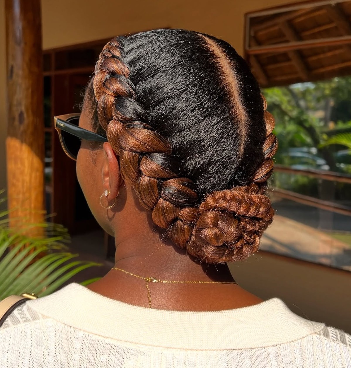 Simple straight braiding is a relatively easy thing to do, especially if you are working with stretched out natural hair. Perfectly symmetrical goddess braids in a bun make it even a better decision! It’s a fabulous choice if you are in search of a classic, timeless style that looks good anywhere, anytime. Nice mommy/daughter option too!