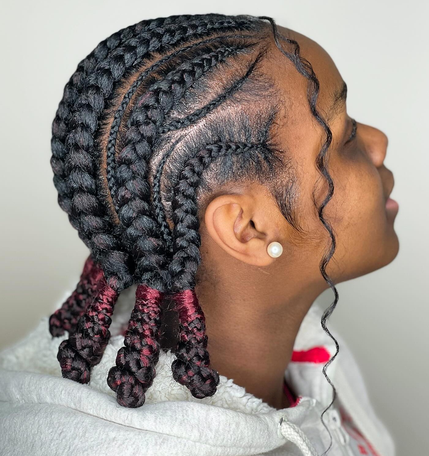 If you are looking for a sizzling way to wear your hair in a ponytail, look no further than curvy cornrows that feed into a wrapped around ponytail. The red-wine colored extensions braided into black hair and mini-parting braids adorned with golden cuffs give this style a refined appearance.