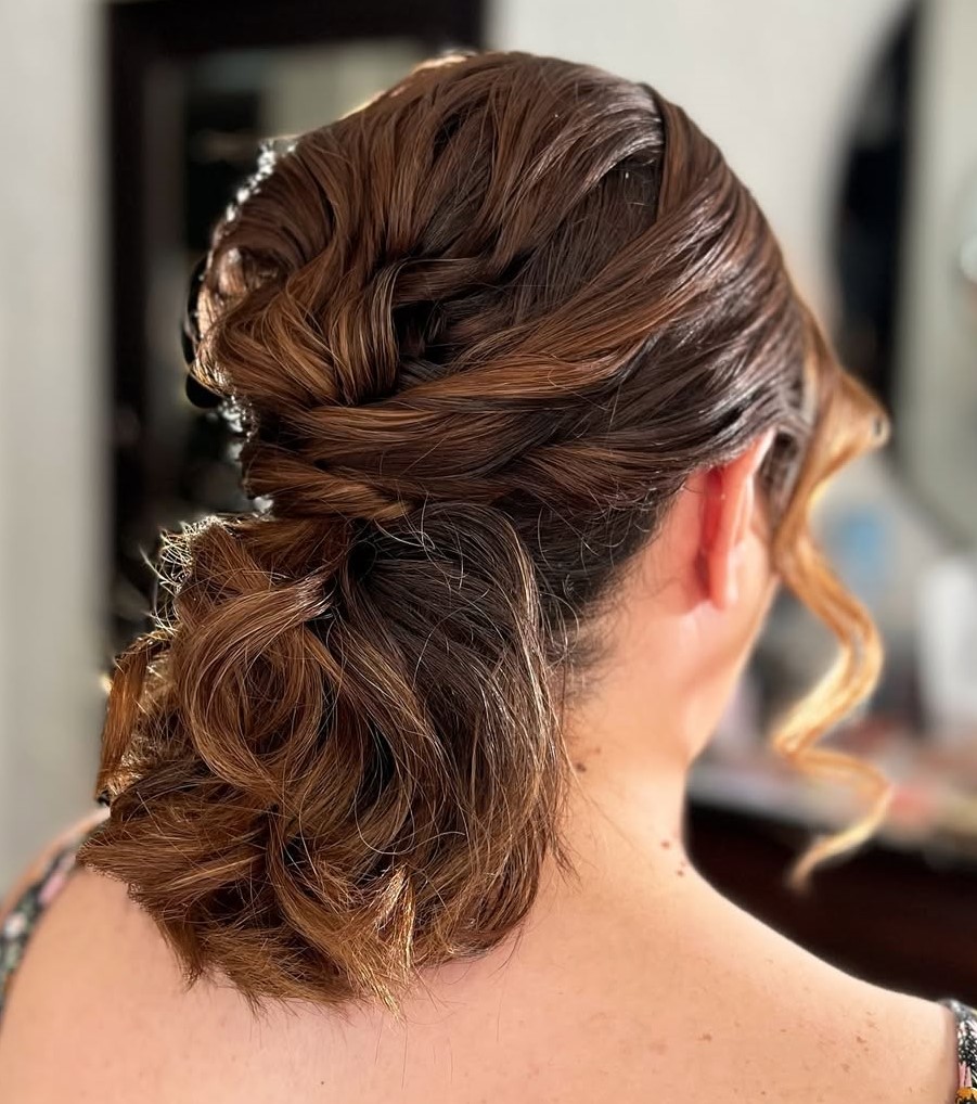 Impeccably balanced and neat, boasting plenty of texture, a low twisted bun is a perfect wedding guest hairstyle for a classy and put-together appearance. An updo can sometimes feel too traditional. To avoid this feel, leave some curls around the front to frame your face and get that relaxed finish.