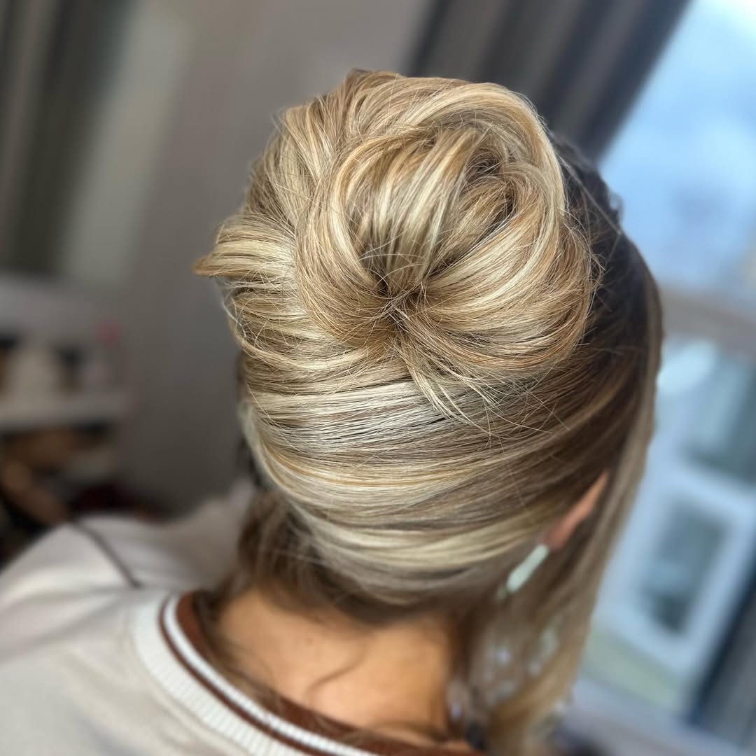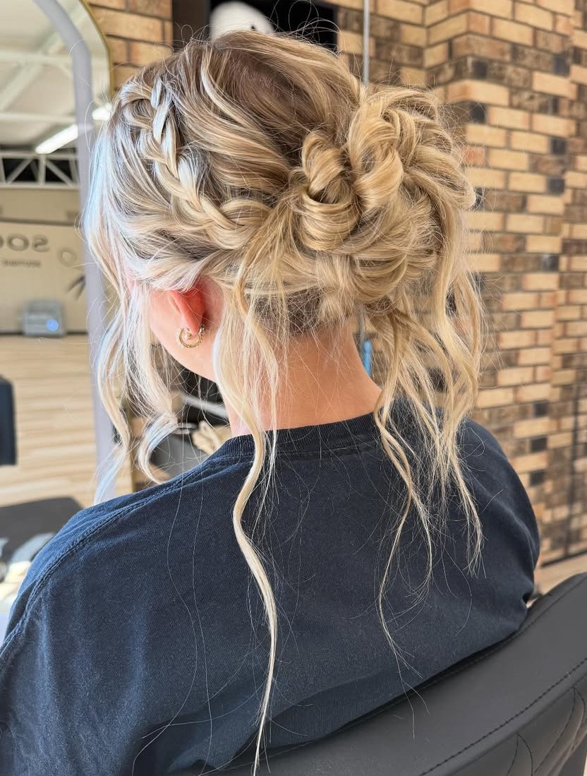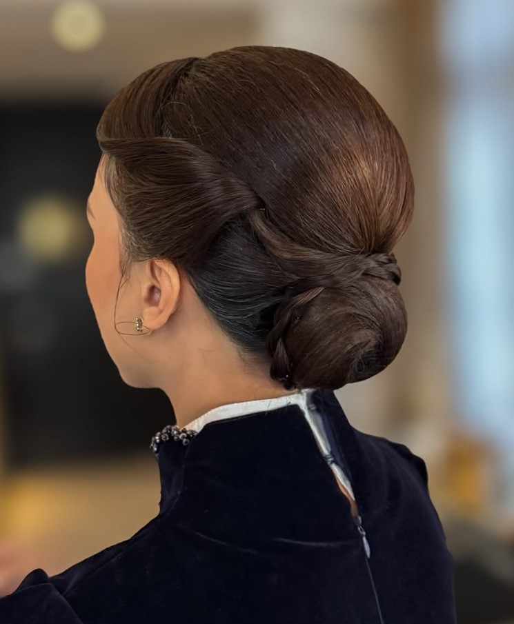 Creating an updo for short hair can be a challenge, but this messy bun proves it’s possible even with a bob. Apparently, nothing is impossible if you get the right hairdresser on board.
