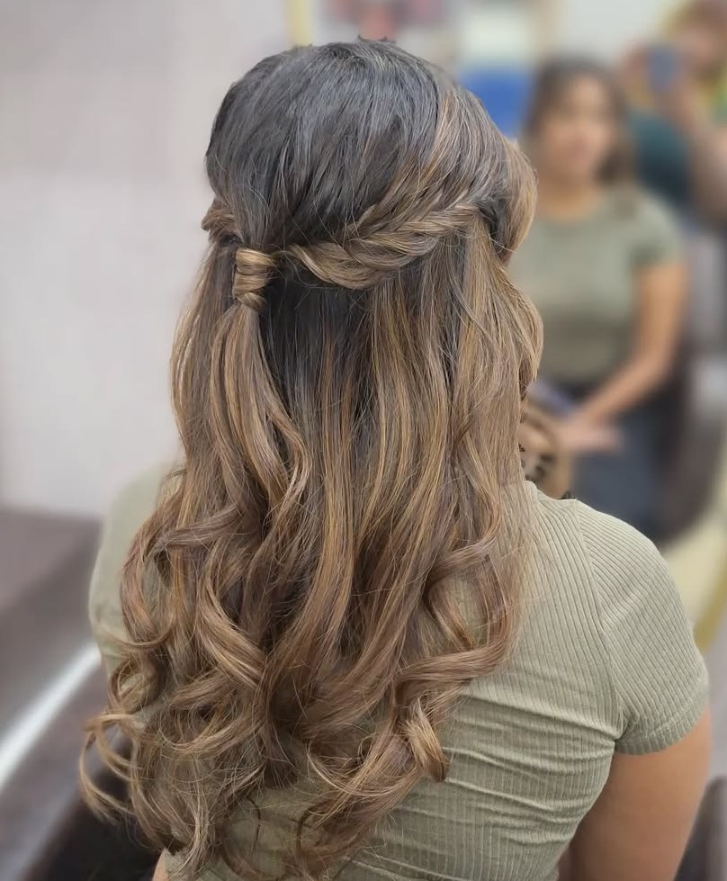 Thanks to its versatility, this half-up, half-down style looks flattering on any hair type and texture. Wear it with a cocktail dress or a floor-length gown – a twisted half-updo is a great choice to match any outfit.