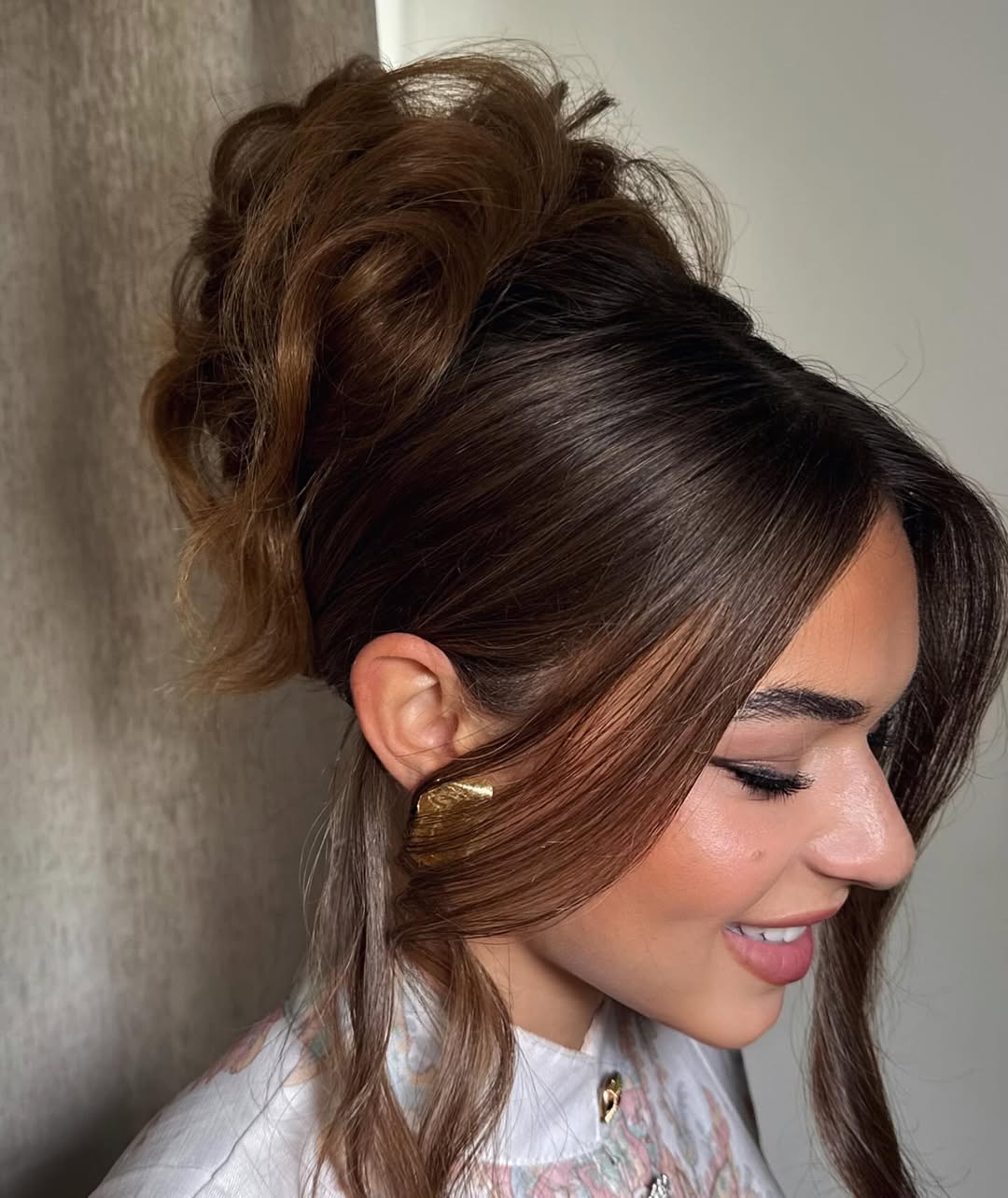 Creating an updo for short hair can be a challenge, but this messy bun proves it’s possible even with a bob. Apparently, nothing is impossible if you get the right hairdresser on board.
