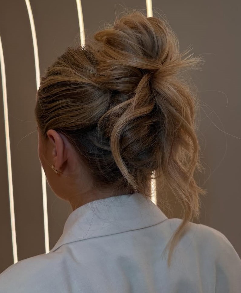 Creating an updo for short hair can be a challenge, but this messy bun proves it’s possible even with a bob. Apparently, nothing is impossible if you get the right hairdresser on board.