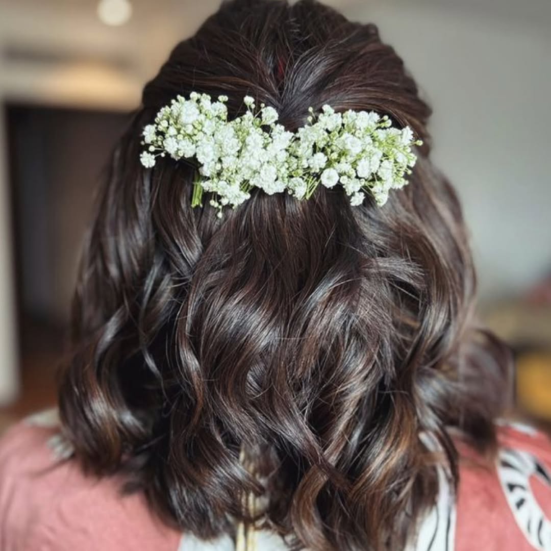 Sleek and smooth on one side, curly and full on the other – we love the contrasting combination of different textures in this hairstyle. Add a bright bloom to match the shade of your dress or your makeup color scheme. This look is superb for short and medium-length curly hair.