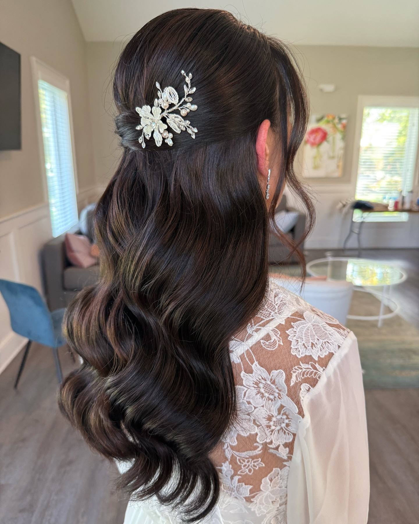 This is one of those highly requested half-up, half-down bridal hairstyles for a straight-haired woman who wants to be all curls on her wedding day. Hair is curled and pulled back halfway, which makes for the perfect location to add an interesting wedding comb or tiara.