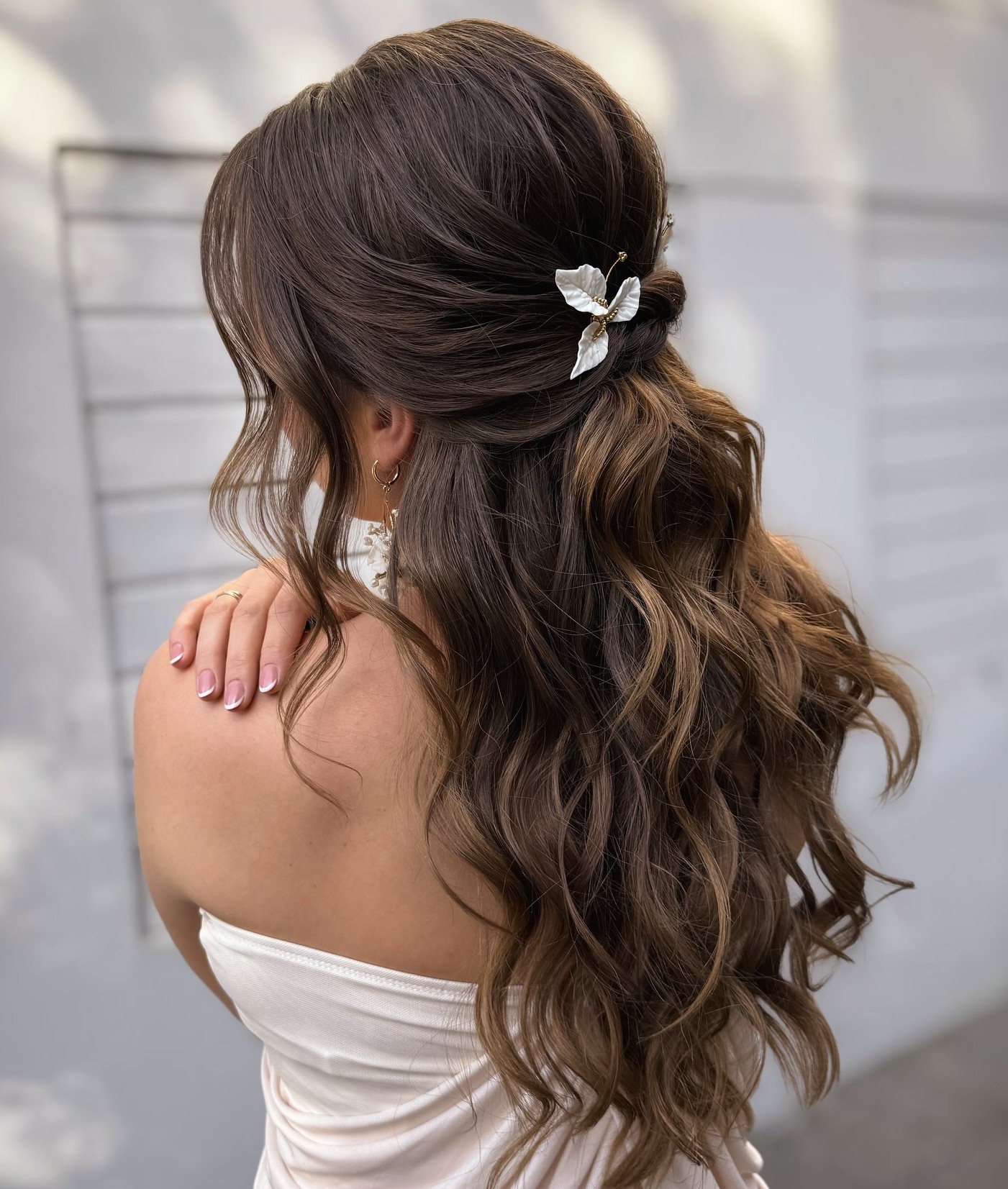 Want to keep your hair away from your face and flowing in soft curls? Try a curly half-up like this. It only benefits from a dynamic clip that you can coordinate with a necklace or shoulder-grazing earrings.