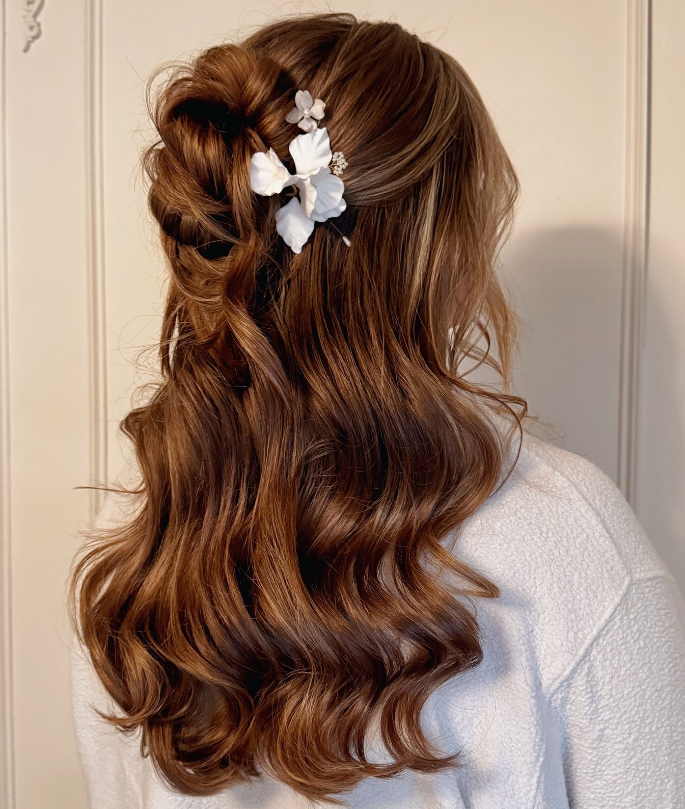 Two braids – one thick, one thin – are placed across the crown of the head, while the front pieces are tucked back and secured in the back with a small sprinkle of flowers. The rear section is allowed to flow freely down the back.