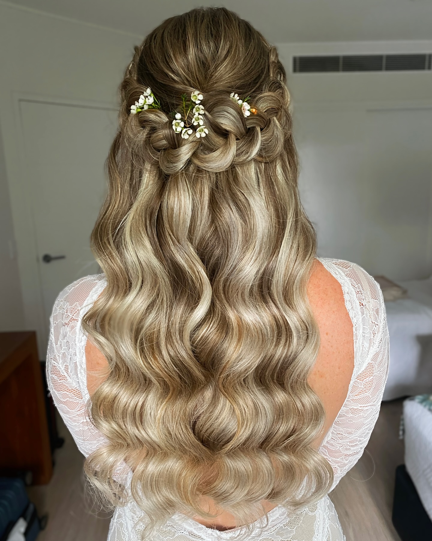 The braids start at the crown, end at the back of the head, and fall into a delicate cascade of curls and waves. This style is stunning both coming and going and ranks among the most detailed half-up wedding hairstyles on our list.