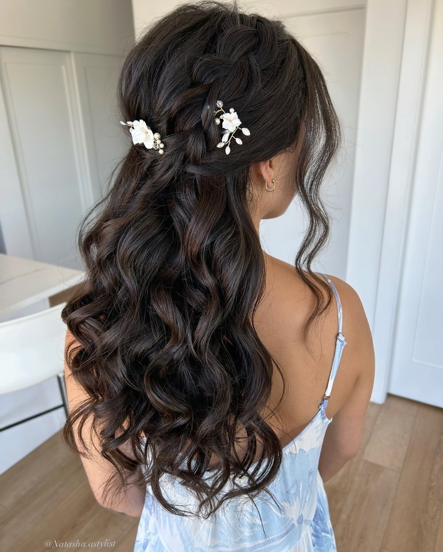 The braids start at the crown, end at the back of the head, and fall into a delicate cascade of curls and waves. This style is stunning both coming and going and ranks among the most detailed half-up wedding hairstyles on our list.