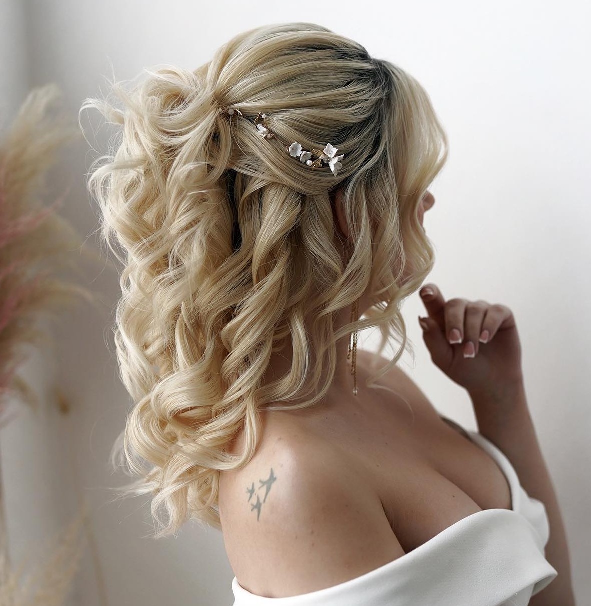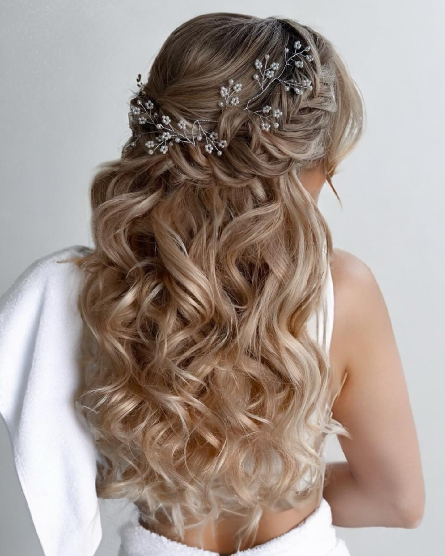 The choice of the right wedding hairstyle is as important as the choice of a wedding dress. If you can’t decide between an updo and a downdo, consider the variety of half-up, half-down bridal hairstyles. This way you’ll enjoy the best qualities of both hairstyle groups – the naturalness and chic of freely flowing locks and the elegance of the lifted up part. This edit spotlights contemporary natural textures alongside romantic styles with braided details and veils.