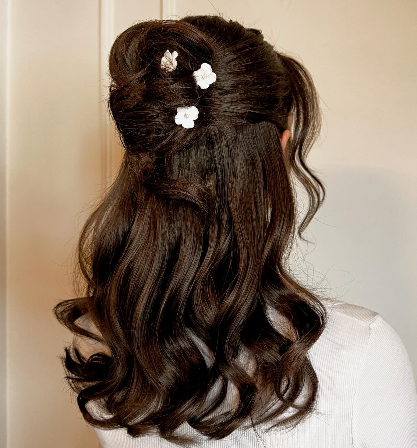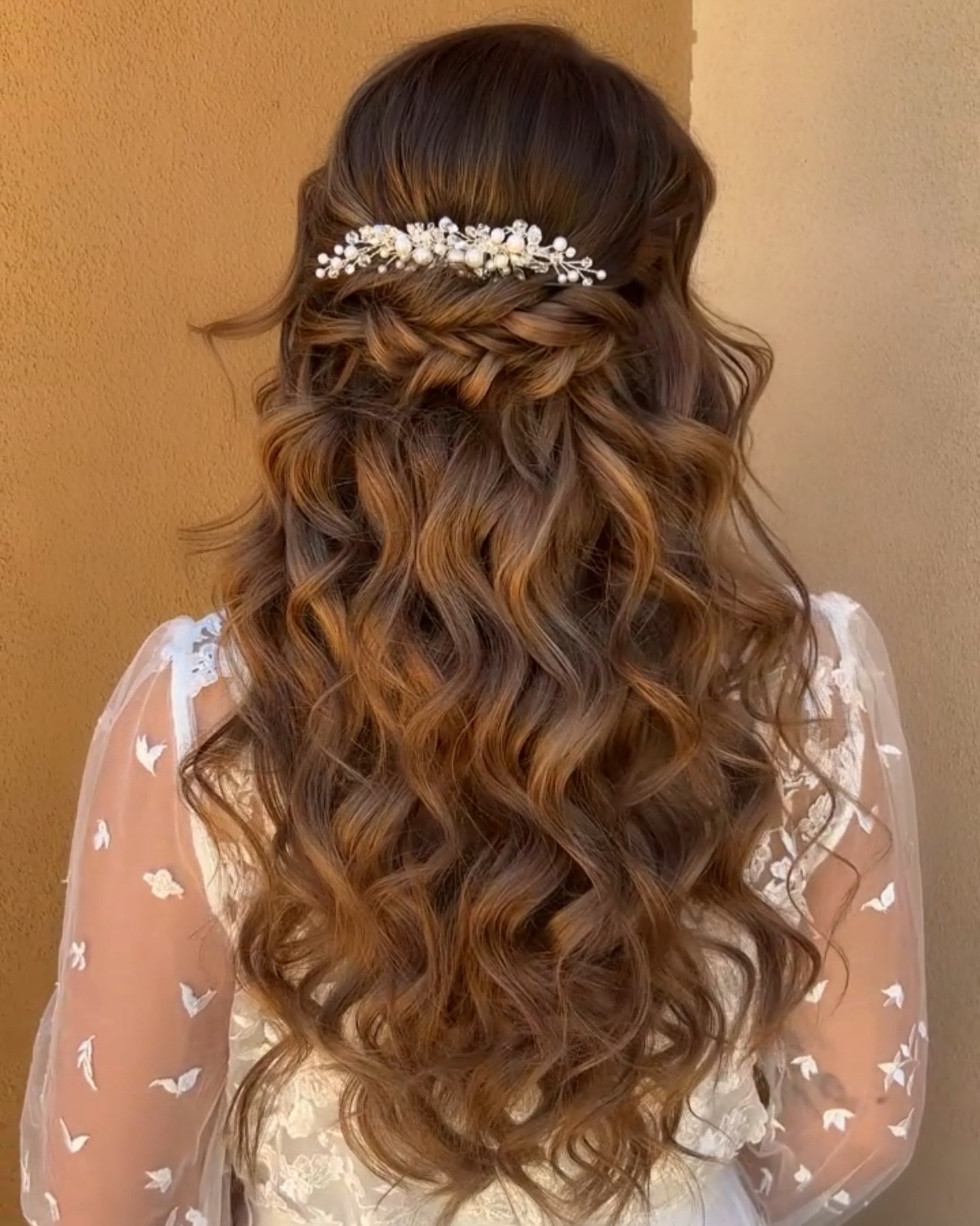 Want to keep your hair away from your face and flowing in soft curls? Try a curly half-up like this. It only benefits from a dynamic clip that you can coordinate with a necklace or shoulder-grazing earrings.
