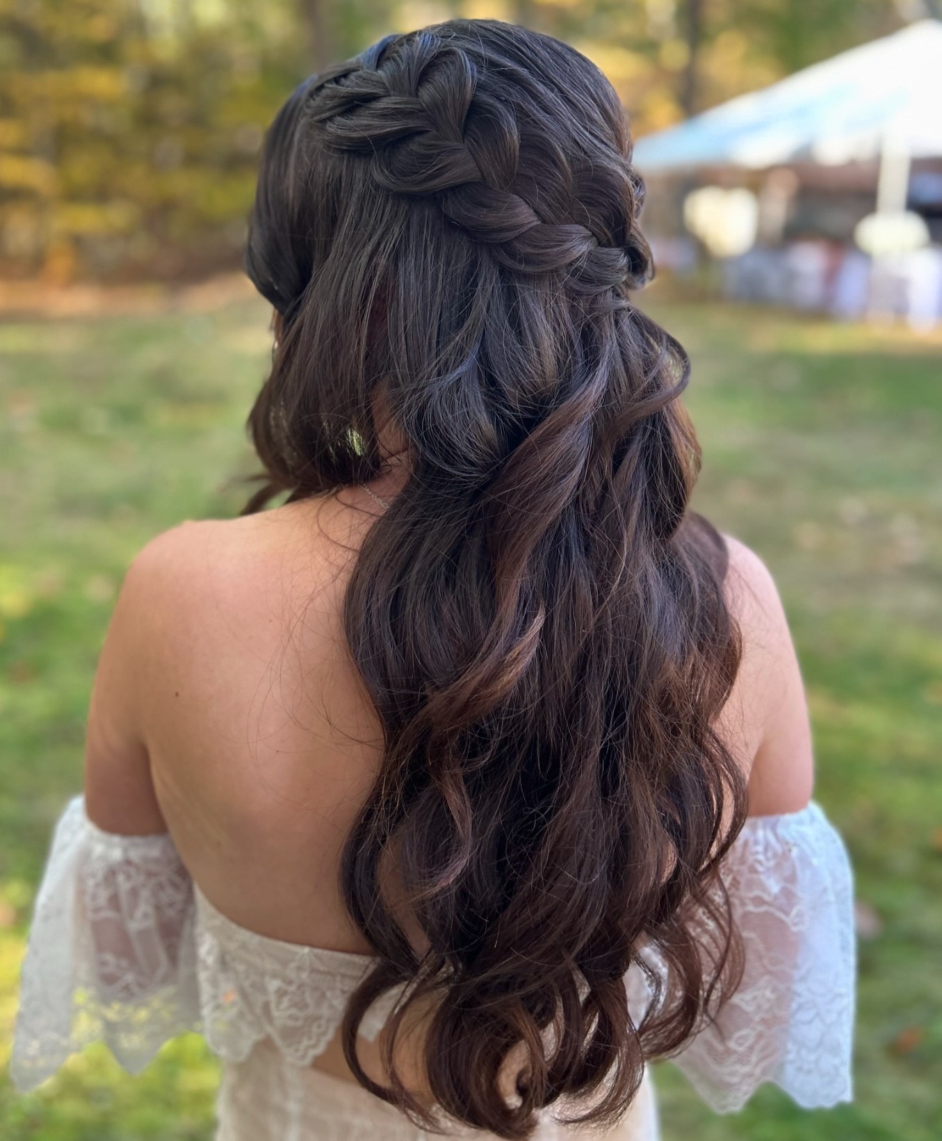 The braids start at the crown, end at the back of the head, and fall into a delicate cascade of curls and waves. This style is stunning both coming and going and ranks among the most detailed half-up wedding hairstyles on our list.
