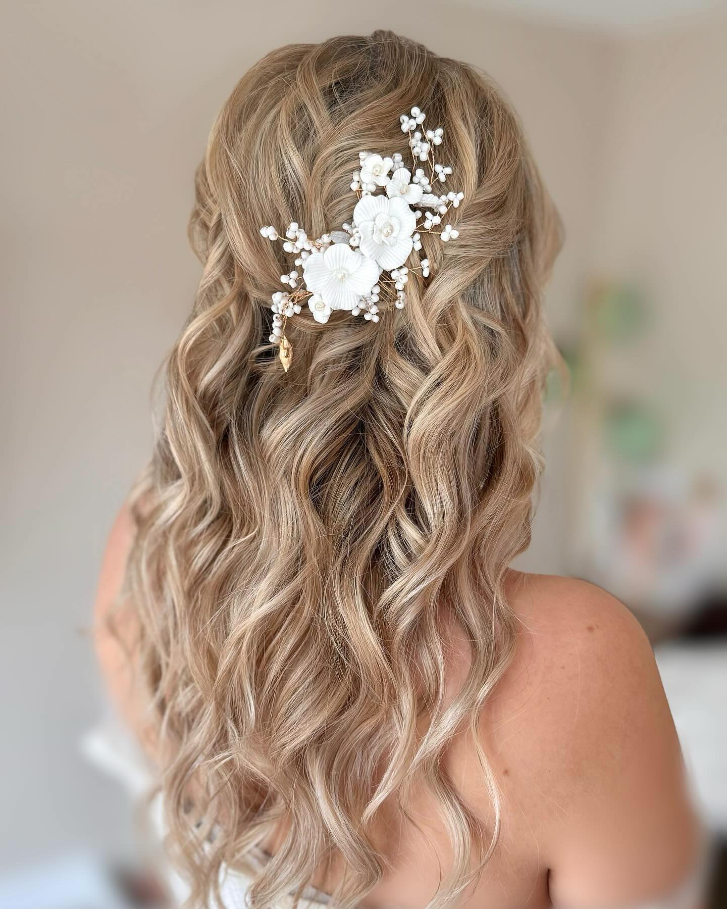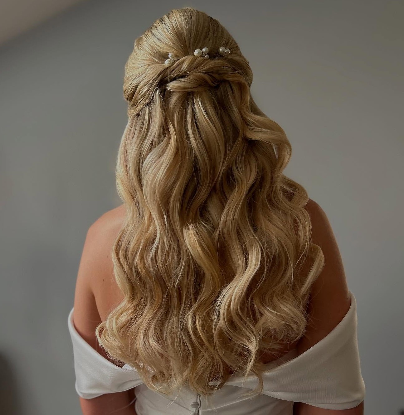 If you want to wear a fluffy bridal veil on your wedding day, a half-up, half-down hairstyle is the most appropriate base for it, especially if your hair is long. You can show off beautiful curls and wear your voluminous wedding veil with ease and comfort.